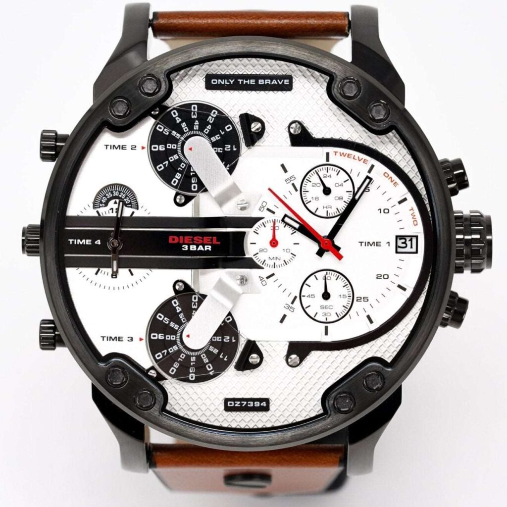 Diesel DZ7394: 57mm stainless steel case, black dial, dual time zone display, chronograph functionality, quartz movement, 30m water resistance. Bold and rugged design for any occasion. This striking timepiece embodies Diesel’s unique and robust style, making it a standout accessory for both casual and formal wear.