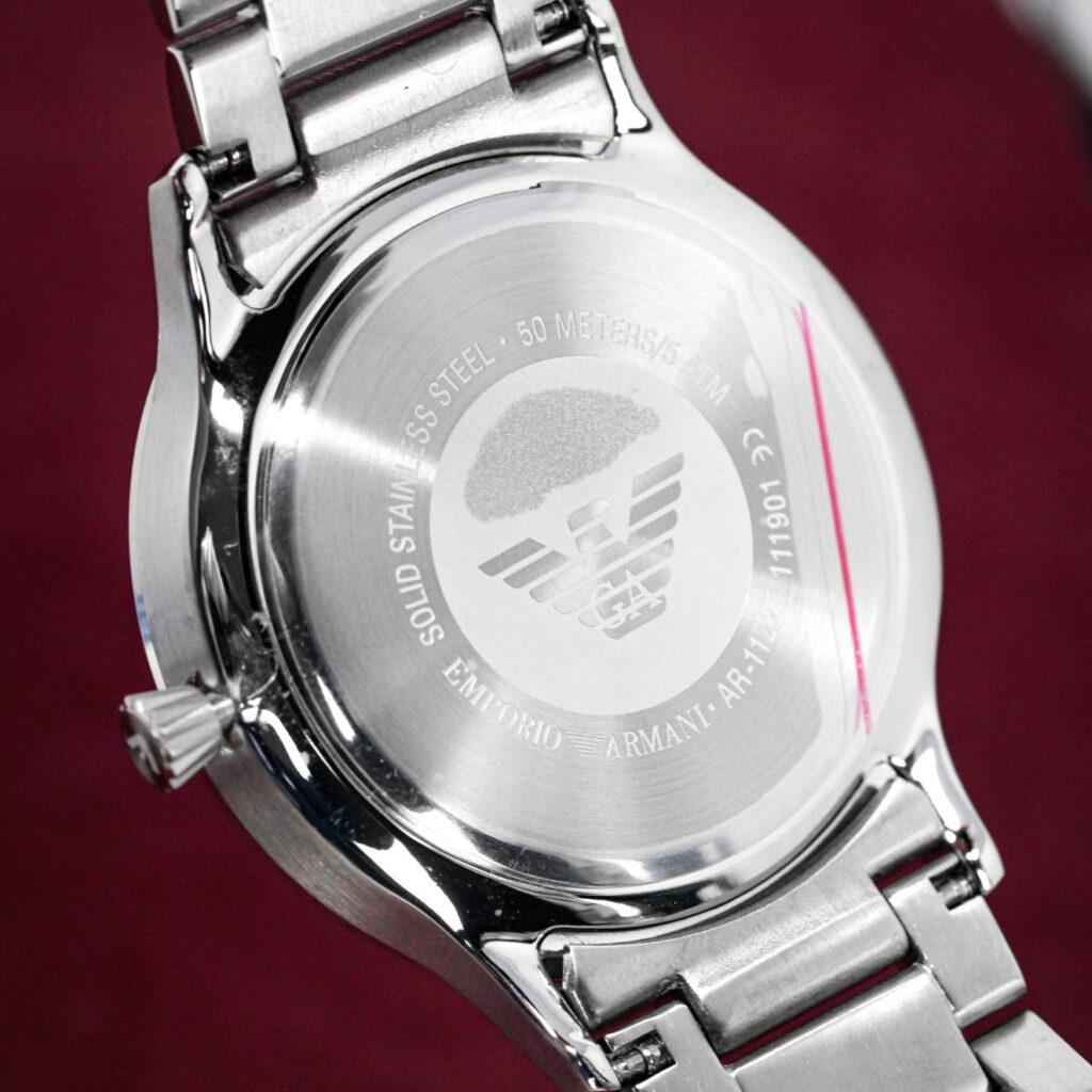 44mm x 7mm Stainless Steel Case. Solid Caseback.