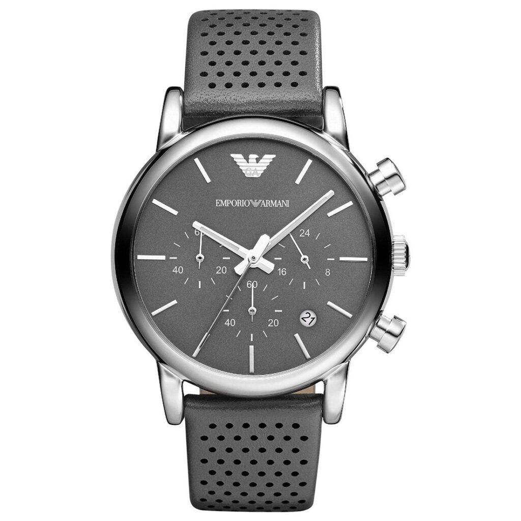 Emporio Armani AR1735 Watch simplistic in its design but superbly crafted with top quality materials and finishing. It features a grey leather strap, a high polished stainless steel case and has a gray dial with three hand movement, sub dial chronograph, and date window dial. You will notice the soft edges and smooth polishing, surrounding a quartz movement with date, chronograph, and 24-hour subdials.