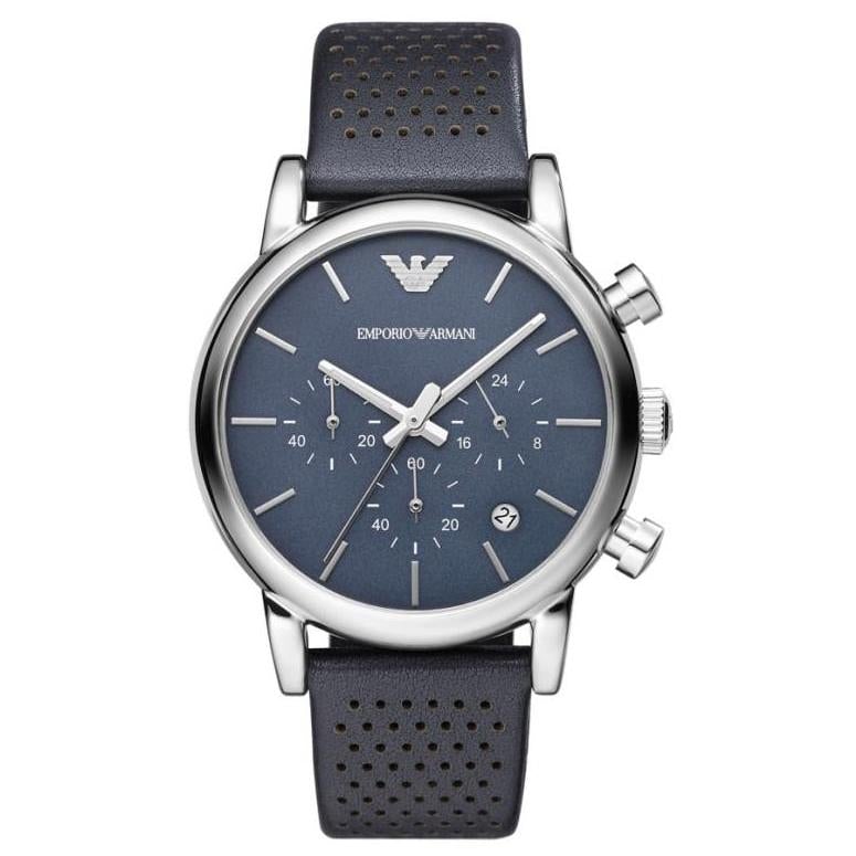 • Men’s Stainless Steel Blue Leather Chronograph Emporio Armani Watch AR1736