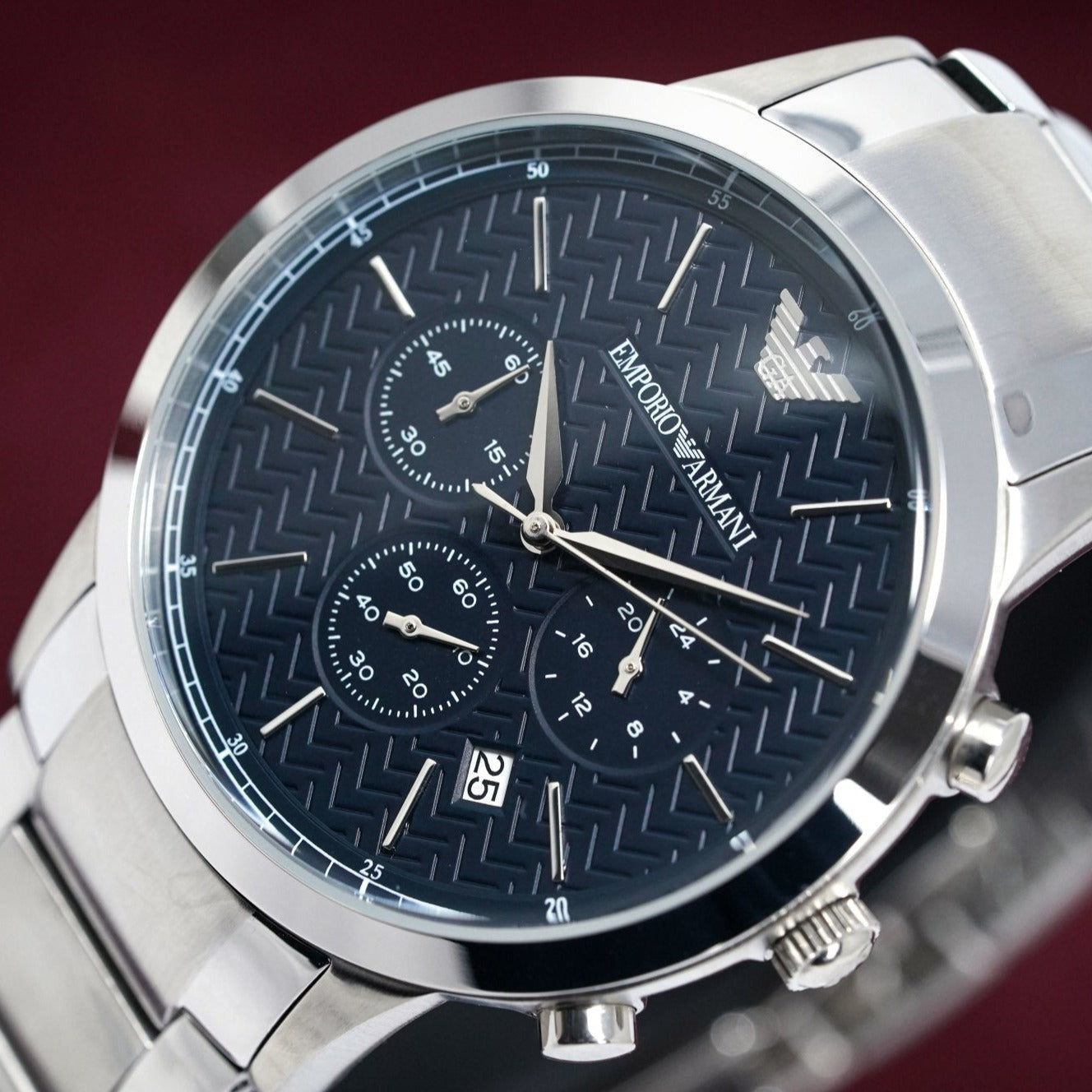 Dark Blue Textured Dial. Stainless Steel Hands and Indexes. Date Between 4 and 5 O’Clock
