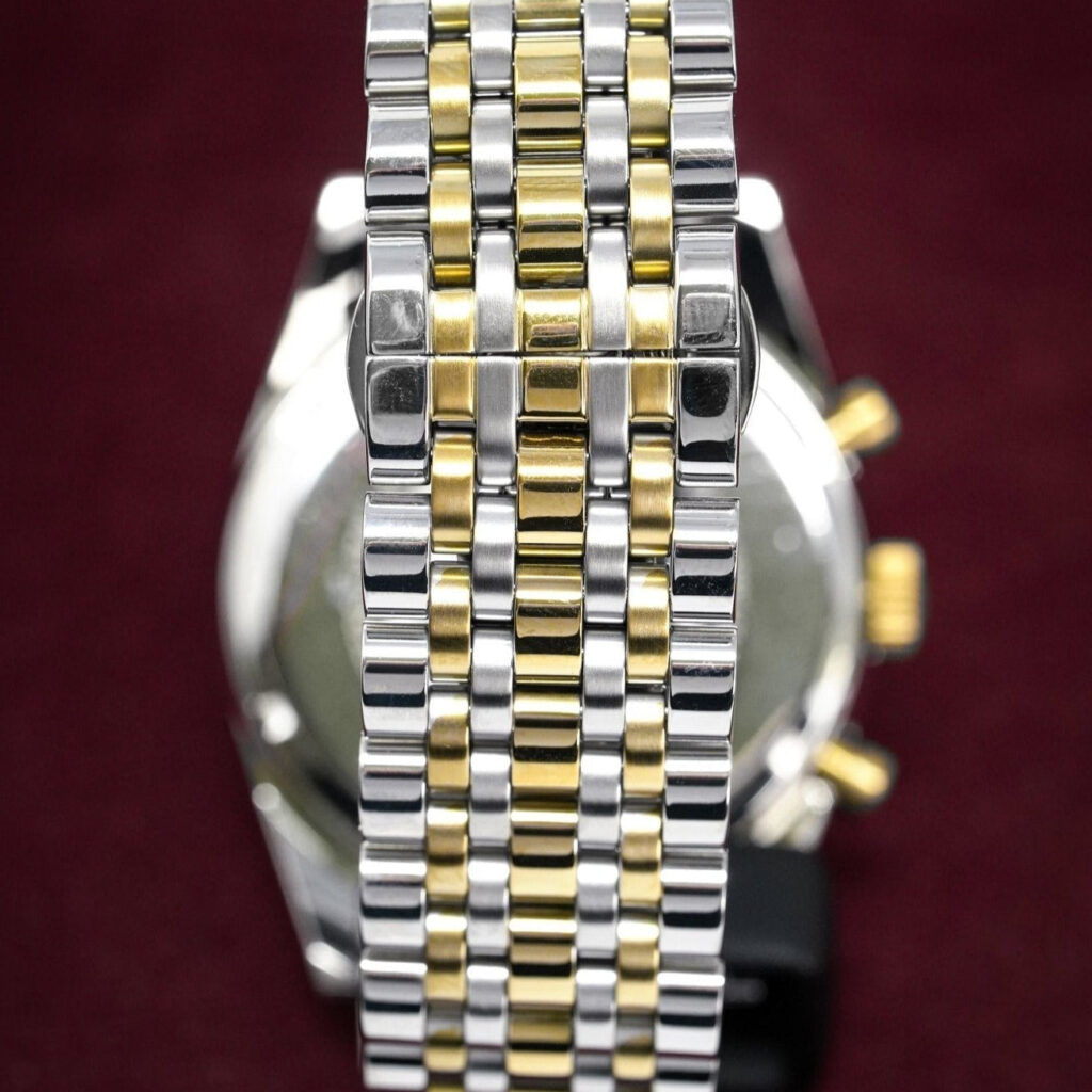 46mm x 13mm Stainless Steel Case. Solid Caseback. Blue Tachymeter Bezel. Gold PVD Plated Steel Pushers and Crown.