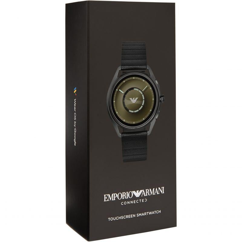 Emporio Armani’s dynamic style meets cutting-edge technology with a new collection of touchscreen smartwatches. This model features the brand’s most iconic design plus all the benefits of modern wearable technology. The Emporio Armani Connected touchscreen smartwatch is compatible with iOS® and Androidâ„¢ phones using Wear OS technology by Googleâ„¢, the Google smartwatch platform, and the Qualcomm® Snapdragon Wearâ„¢ 2100 platform. Stay connected through texts and notifications sent directly to your smartwatch and choose your style with a customizable dial. Connect your favorite apps to keep track of your fitness activities and access your music library. This model is made of leather and has a stunning display with a contrasting edge.