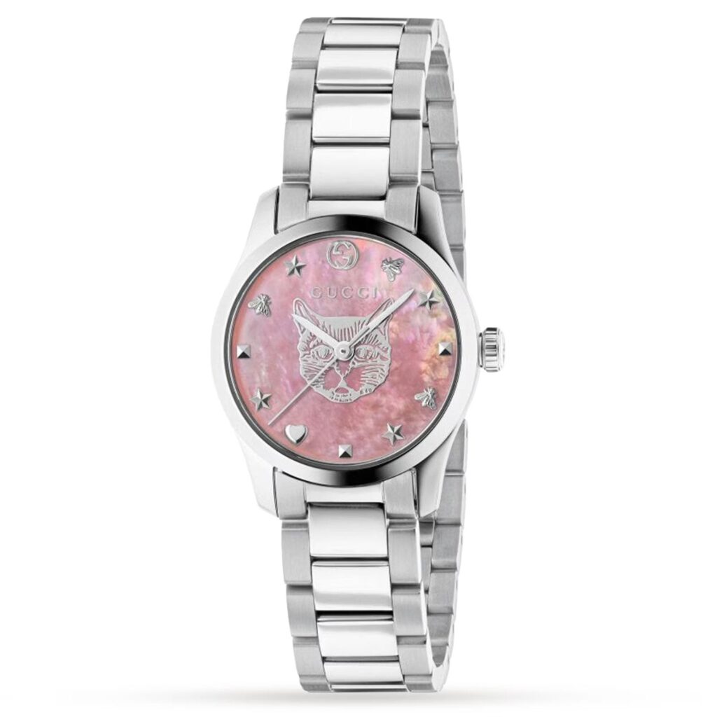 Designed with a steel case and bracelet completed with a pastel pink mother of pearl dial, a new addition to the G-Timeless collection is introduced for Cruise 2020. At the centre is the Mystic Cat motif, surrounded by other codes of the House displayed as the watch’s indexes, including the star, Gucci bee and Interlocking G. Steel case, pink mother of pearl dial with feline head motif, steel bracelet The warranty certificates for Gucci watches purchased after March 1st 2022 are exclusively available online. Download your certificate at https://watchwarranty.gucci.com by using the serial number engraved on the back of your watch. Quartz movement Water resistance: 5 ATM (160 feet/50 meters) YA1265013 Swiss Made