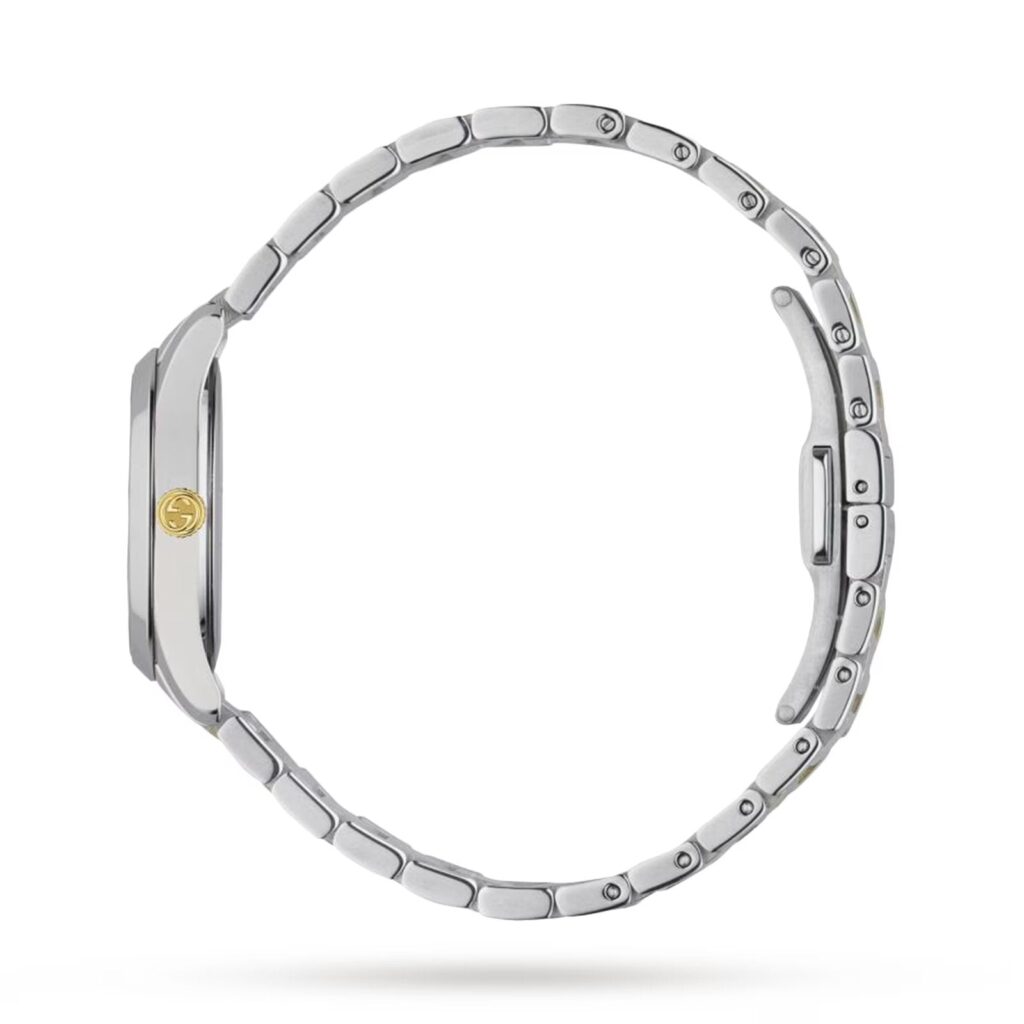 Part of the G-Timeless collection, this classic watch in steel and yellow gold PVD is designed with a traditional sensibility, juxtaposed with codes inspired by the Gucci narrative. Steel case , silver sunbrushed dial with yellow gold PVD feline head with diamond indexes, steel and yellow gold PVD bracelet Sapphire glass The warranty certificates for Gucci watches purchased after March 1st 2022 are exclusively available online. Download your certificate at https://watchwarranty.gucci.com by using the serial number engraved on the back of your watch. 5 ATM (164 feet / 50 meters) Quartz movement Wrist size from 4.3″ to 6.7″ YA1265016 Swiss Made