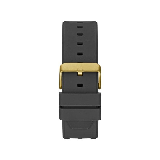 Guess Gents Watch With Brushed Gold Case, Black/Champagne Multi Function Dial, Black Textured Silicone Strap