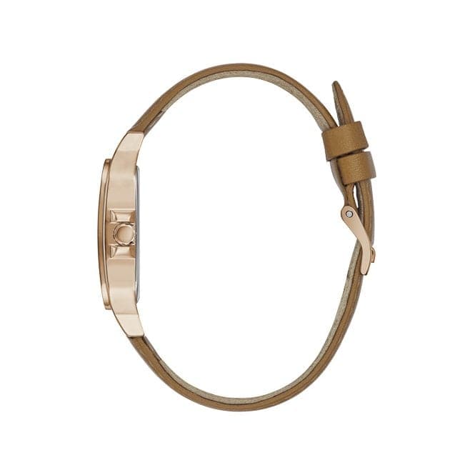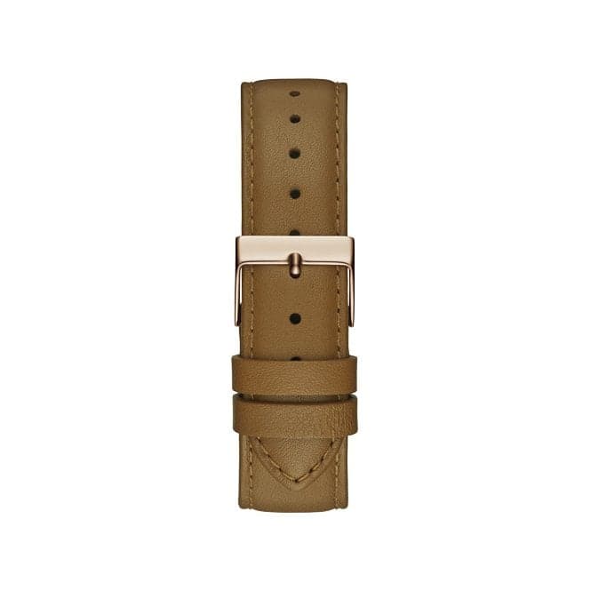 Guess Ladies Watch With Polished Rose Gold Tone Crystal Case. Sunray White Multi Function Dial With Brown Smooth Leather Strap