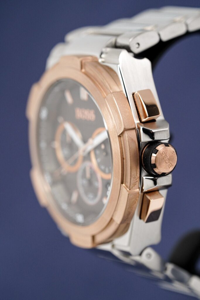 45mm Stainless Steel Case. Scratch Resistant Mineral Crystal. Rose Gold PVD Plated Steel Bezel.