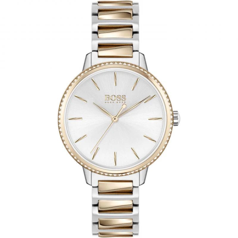 The Hugo Boss 1502567 Signature Watch is a sophisticated and functional timepiece designed for women. This watch features a two-tone stainless steel bracelet, combining a polished silver-tone case with rose gold-tone accents, creating a refined and luxurious look. The silver dial is adorned with crystal-set markers and rose gold-tone hands, providing elegance and readability. This stylish watch is perfect for both casual and formal occasions, offering durability and classic design.