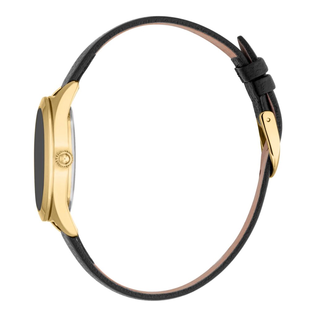 Ignite sleek sophistication with a luminous yellow gold round case, textured with refined IP finish and adorned with delicate zircon stones. Feel the cool, polished surface under your fingertips, capturing movement with every subtle shift of light. Designed for effortless elegance, it elevates your urban style for moments that demand a touch of luxe and versatility. A promise of timeless chic, perfect for day-to-night allure.