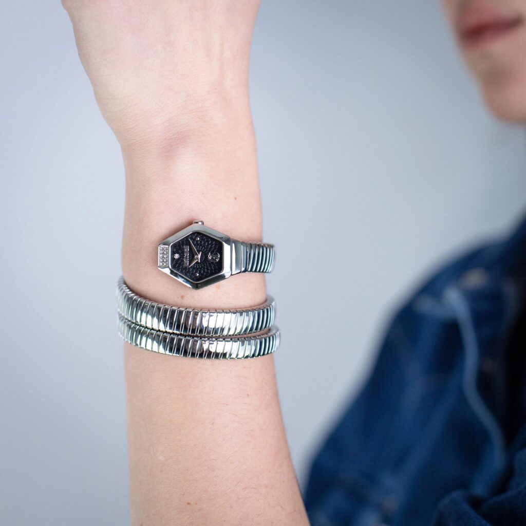 Sculpt this hypnotic, sinuously winding silhouette in deep midnight black and shimmering, polished silver tones with the weightless interplay of light on the skin of a sharp and glamorous character. Essential lines and reflections that enhance the wrist, designed for high-end cocktail evenings, exclusive metropolitan gala events and vibrant urban sunsets with an avant-garde touch that defines every look.