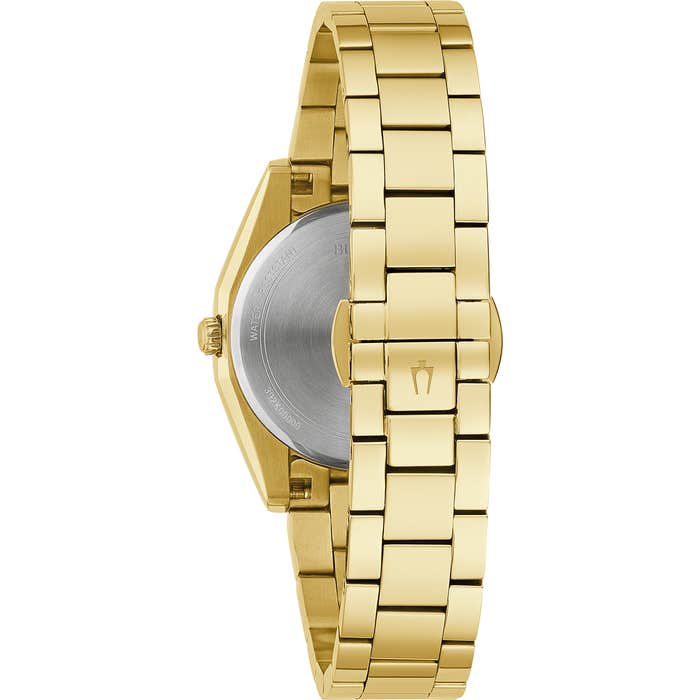 The Bulova ladies’ Surveyor watch is a classic timepiece that will never go out of style. The gold-tone stainless steel case features sculpted edges and faceting which offer an effortless wear on the wrist, with polished and brushed finishing, a sapphire crystal, and a matching 3-link gold-tone stainless steel bracelet with quick-release tabs and a push-button deployment clasp. The lustrous mother-of-pearl* dial offers a sophisticated radiance, appointed with 11 diamond hour makers and a gold-tone handset. With strikingly beautiful details and flair, this Bulova ladies’ timepiece brings timeless elegance to any occasion.