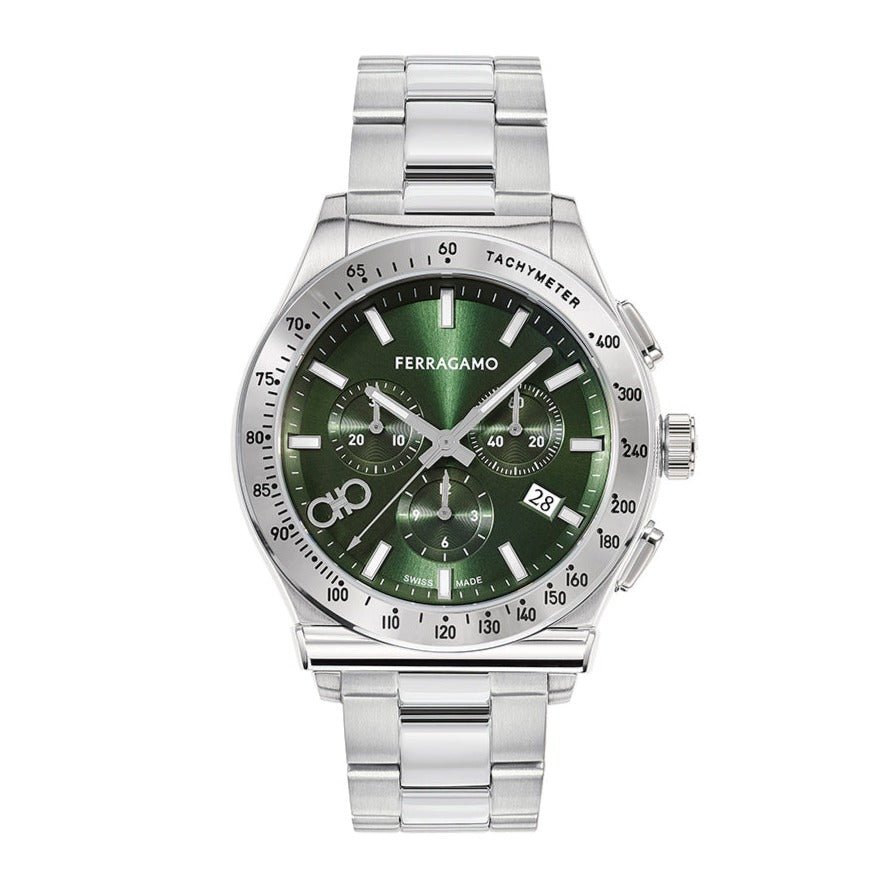 Salvatore Ferragamo 1927 Chrono Green Dial Silver Steel Strap Watch For Men Sfkz00423