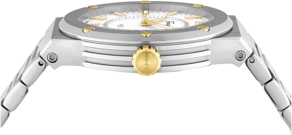 Introducing the Ferragamo F-80 watch, a quintessential timepiece for the modern man. Swiss-made with a reliable quartz movement, this men’s watch features a silver-toned round stainless steel case, spanning 44mm in width, protected by scratch-resistant sapphire crystal. Its silver dial incorporates a convenient date feature, adding an extra touch of practicality.