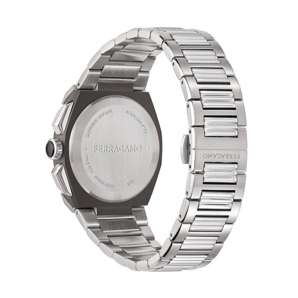 Due to its great success, the iconic Ferragamo Sapphire watch collection is re-imagined with a complex chronograph movement. Sapphire crystal covers the dial and the top ring creating a beautiful, unique layer. For this new collection, the Double Gancini logo is featured on the dial along with the chronograph counter, giving a sporty yet luxurious feel to this successful watch collection.