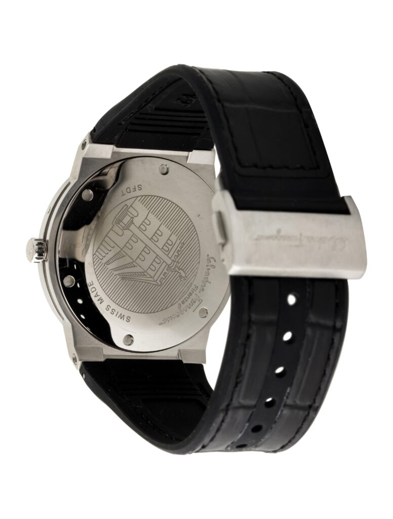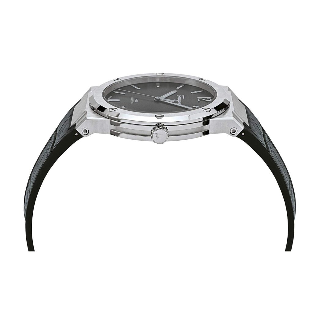 The new F-80 Classic collection comes with a slimmer and smaller case. Its sport-luxury spirit has made it a bestselling Salvatore Ferragamo Timepieces line. Its genuine leather strap flaunts a black hue that accentuates the look of the watch. Furthermore, it is completed with a deployment buckle clasp that ensures a secure fit on the wrist.