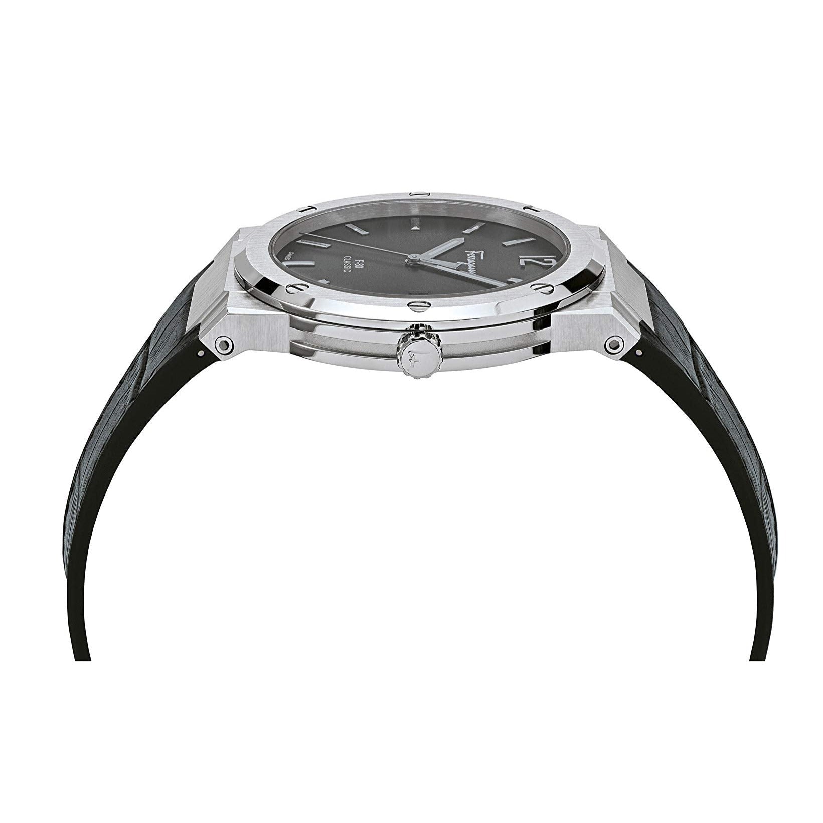 Ferragamo’s ever-popular F-80 timepiece is a sport luxury staple with a slimmed-down stainless steel case and embossed black leather strap.