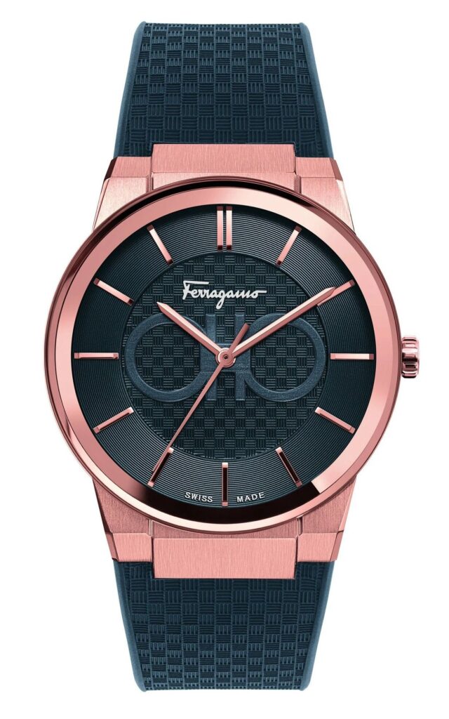 Black (Double Gancini Logo) dial enhanced by rose gold-tone hands. Rose Gold-plated stainless steel case with a black rubber band. Quartz movement. 50 meters / 165 feet water resistance. Fixed bezel. Scratch Resistant Sapphire crystal. Solid caseback. Deployant clasp. Pull / Push crown. Case size 41 mm x 8.1 mm. Band 26 mm x long. Salvatore Ferragamo SFHP00420 Watch.