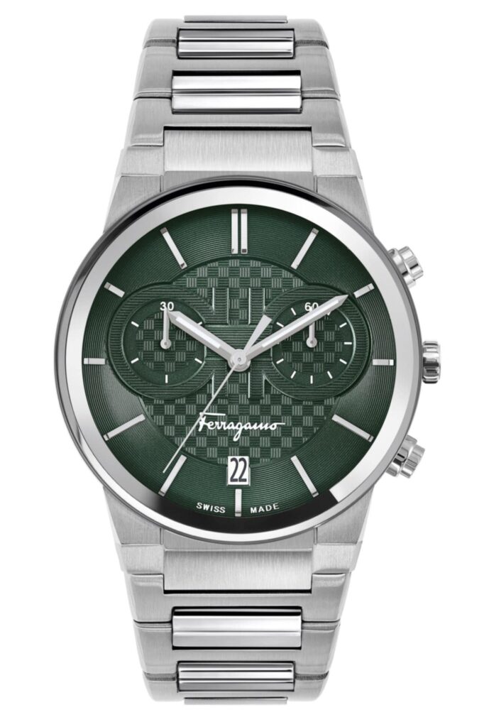 • Ferragamo Sapphire Mens Watch 41mm Stainless Steel Case Green Guilloché Dial Stainless Steel Bracelet