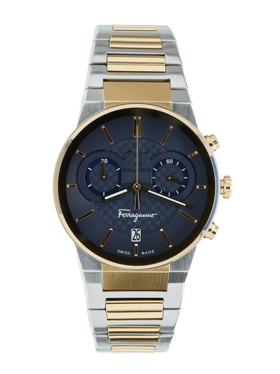 Brand New Authentic Salvatore Ferragamo Sapphire Men’s Watch Model SFME00521. Stainless Steel case with Two-Tone Stainless Steel watch band. Deployment clasp. Blue dial. Battery Operated Quartz movement. Round case shape. Case size: 41mm. Case thickness: 10.3mm. Solid case back. 50 Meters – 165 Feet water resistant.