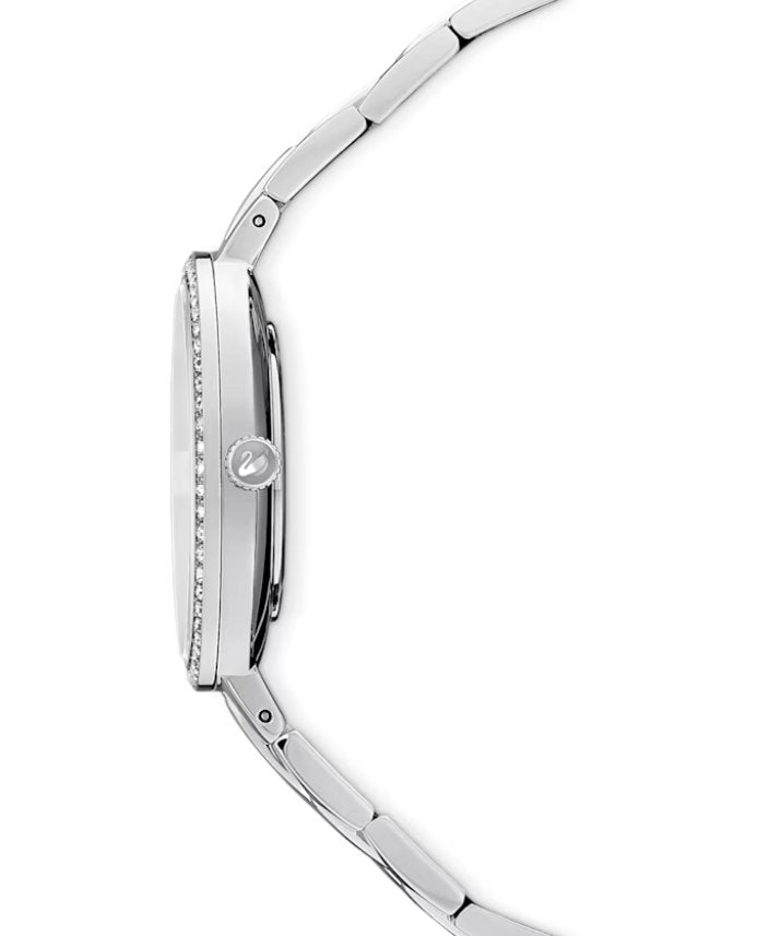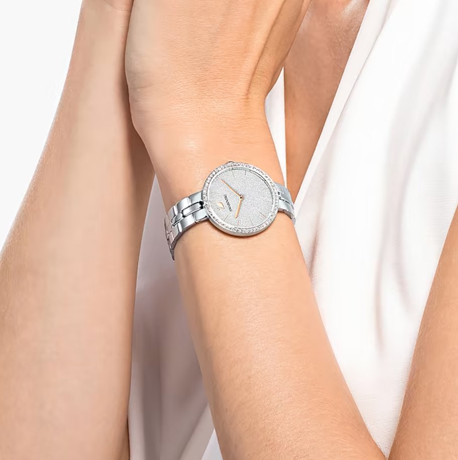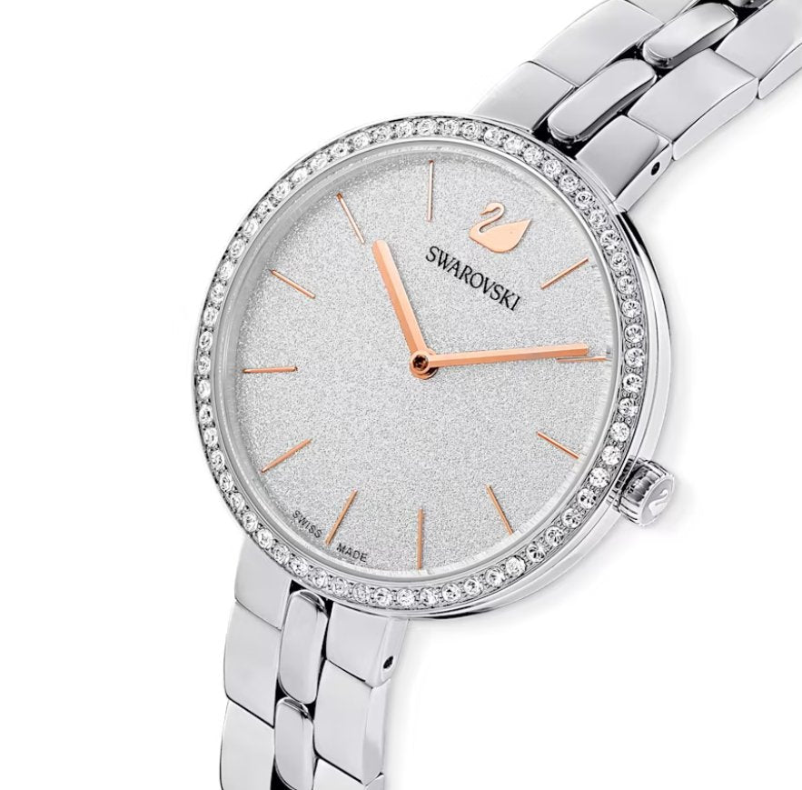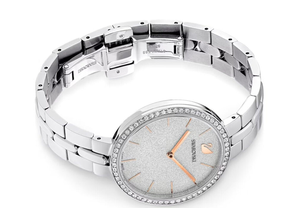 Silver Crystal Dial – Polished Stainless Steel Hour and Minute Hands – Swarovski Logo at 12 O’Clock.