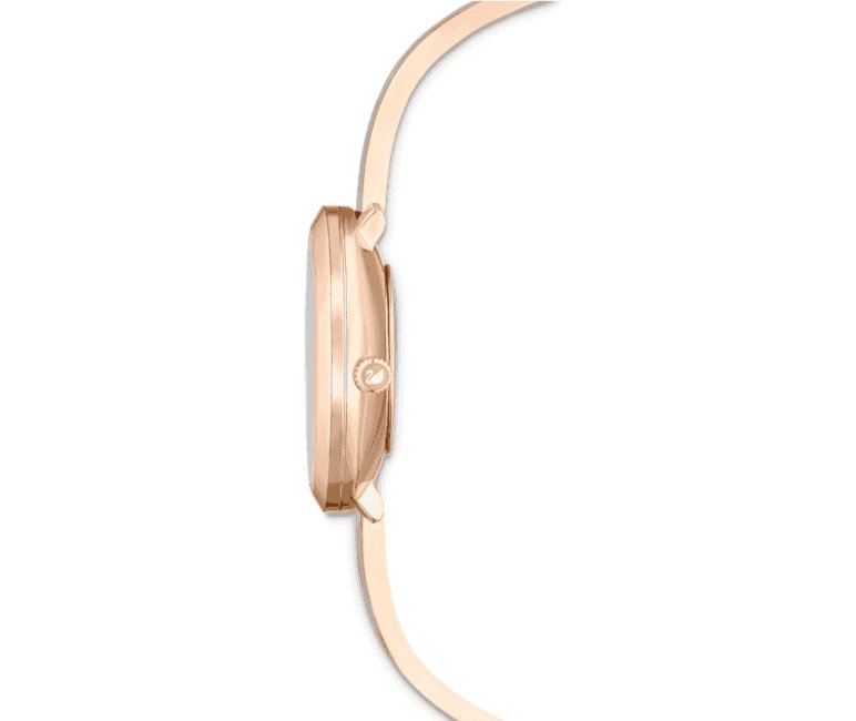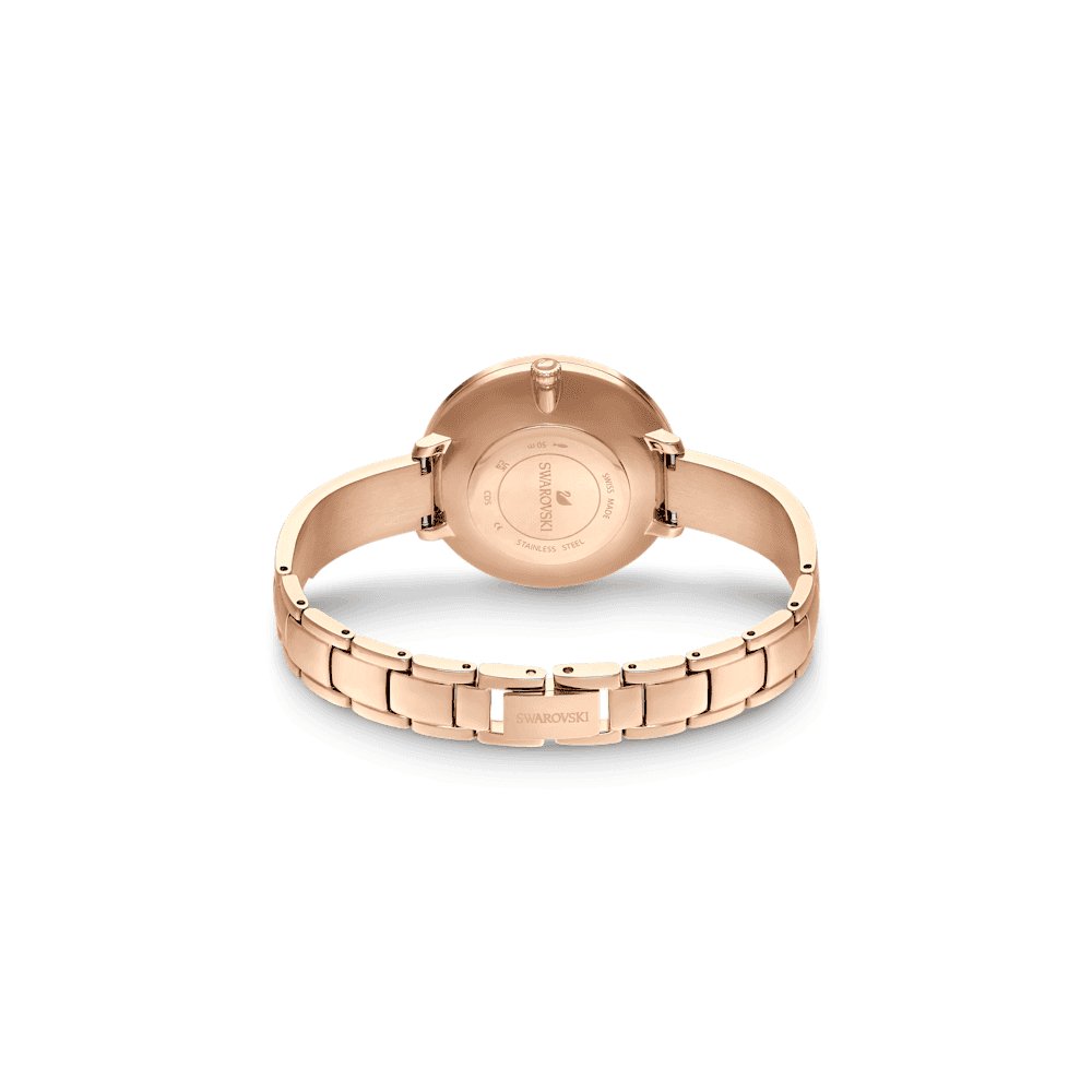 White Crystal Dial – Polished Rose Gold PVD Plated Stainless Steel Hour and Minute Hands – Swarovski Logo at 12 O’Clock.