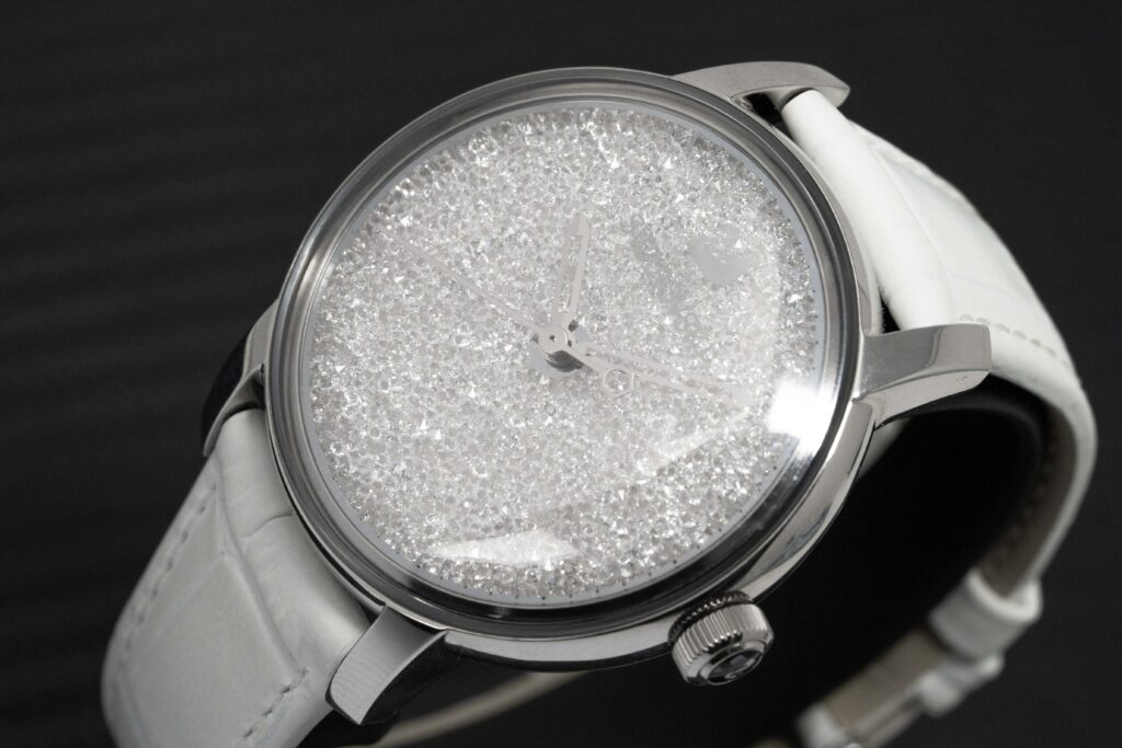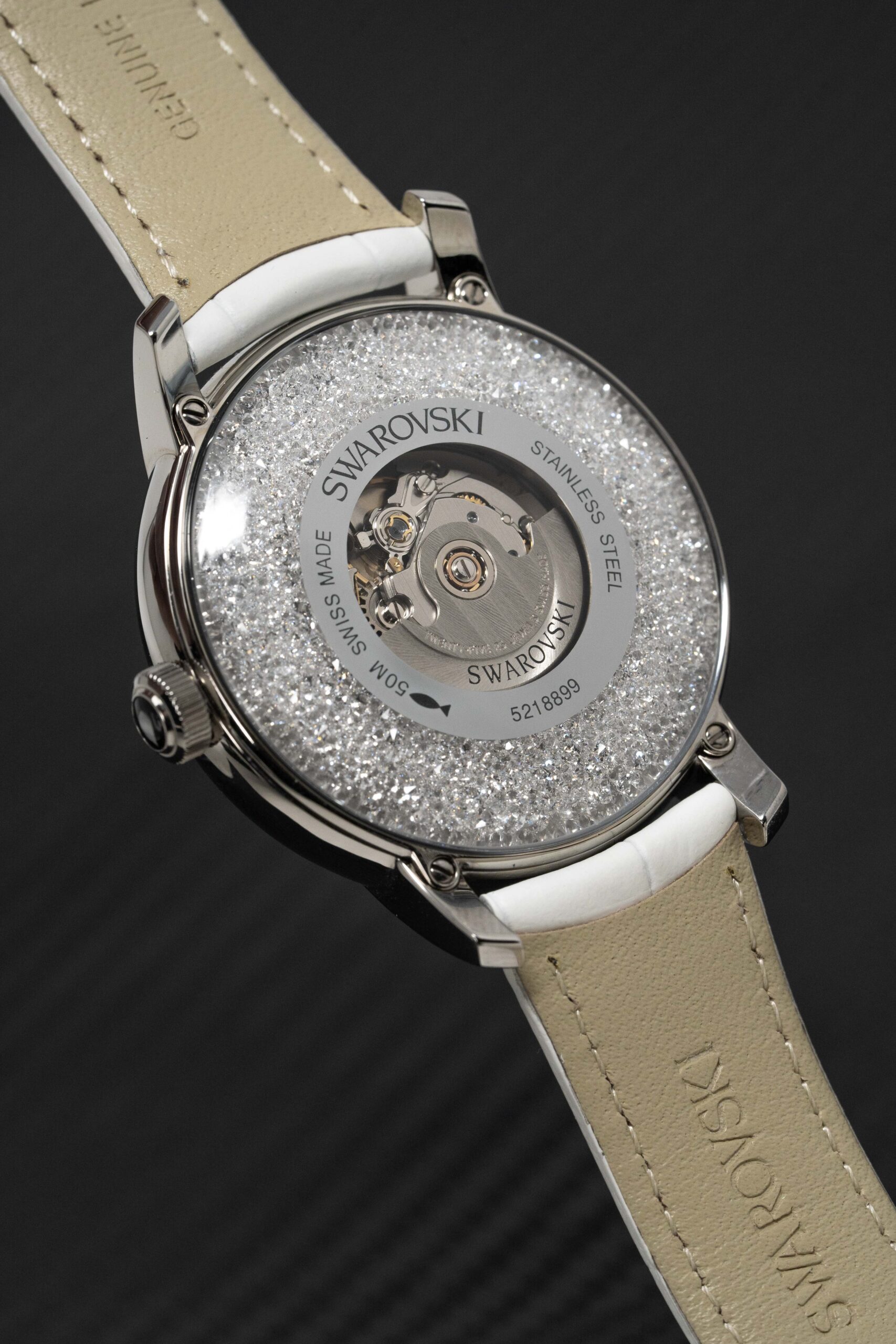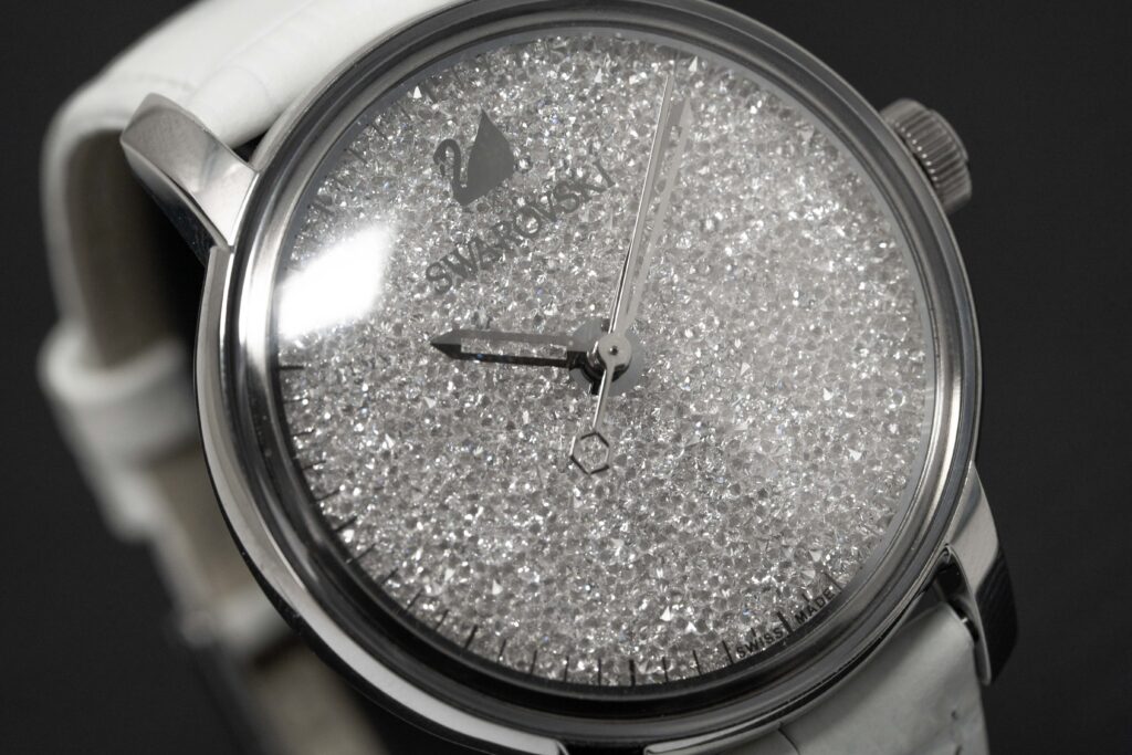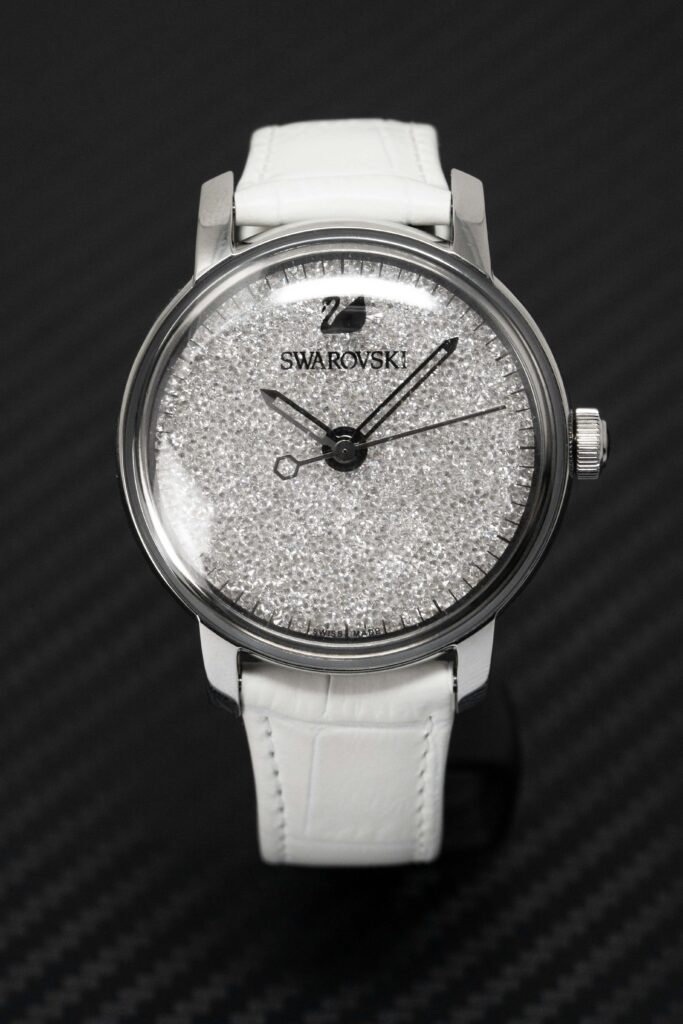 Silver Crystal Dial – Polished Stainless Steel Hour and Minute Hands – Swarovski Logo at 12 O’Clock.