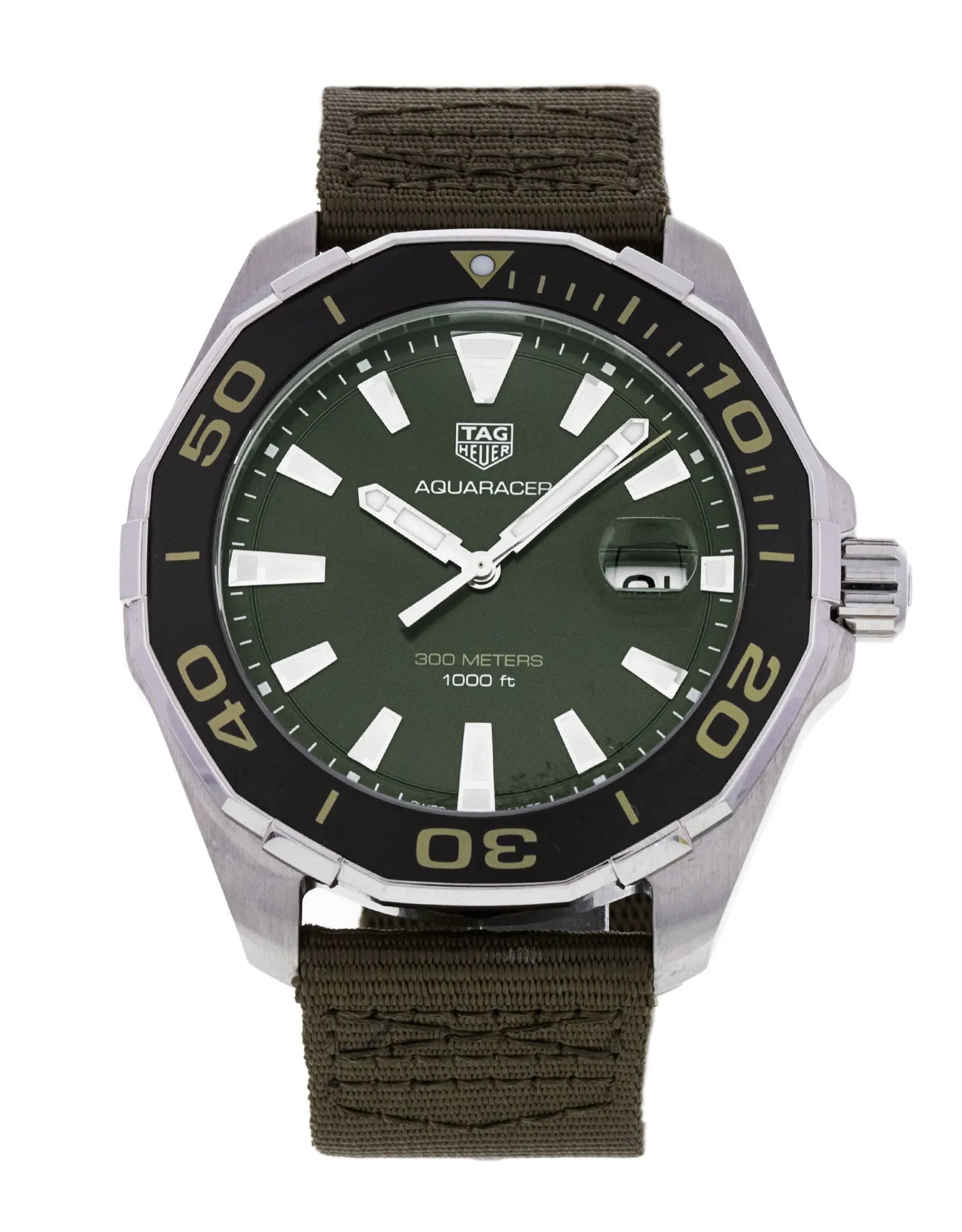 TAG Heuer Aquaracer WAY101E.FC8222 Men’s Watch. Features a brushed and polished stainless steel case and comes on a khaki textile strap. A 60 minute scale is located on the anthracite aluminum fixed bezel. The khaki sunray brushed dial features luminescent hour hand, minute hand and hour markers with white SuperLuminova.