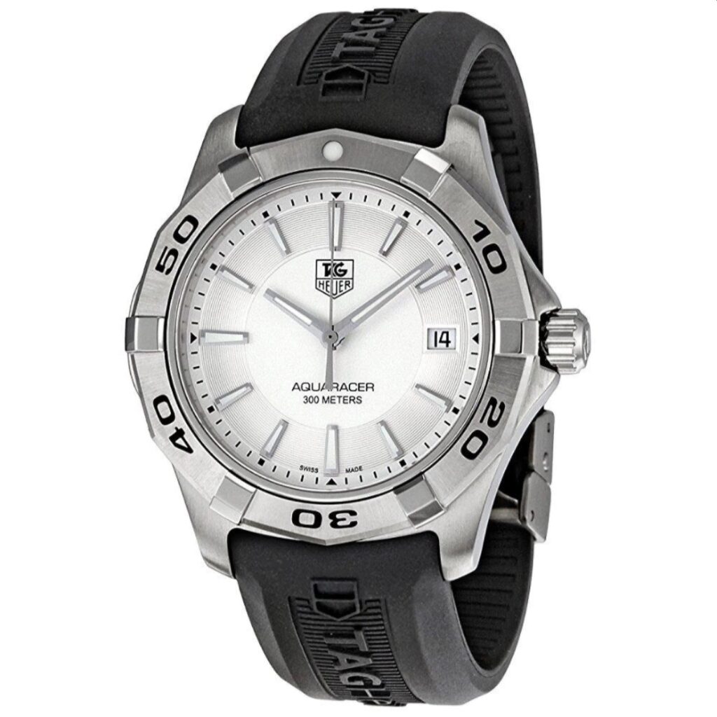 Quartz movement. Scratch resistant sapphire crystal. Screw down crown. Solid case back. Round case shape. Case size: 40.5 mm. Case thickness: 12 mm. Band width: 20 mm. Tang clasp. Water resistant at 300 meters / 1000 feet. Functions: date, hour, minute, second. Aquaracer Series. Dive watch style. Watch label: Swiss Made. Tag Heuer Aquaracer Quartz Silver Dial Mens Watch WAY1111.FT8021.
