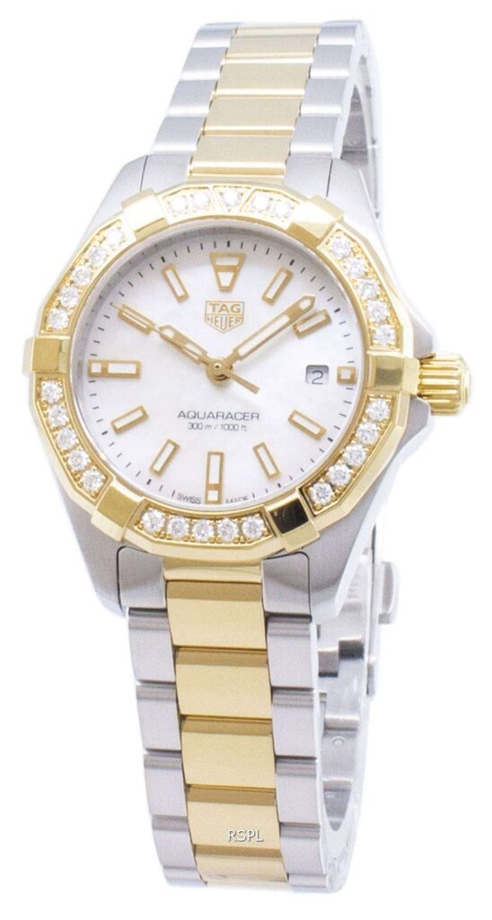 The TAG Heuer Aquaracer Quartz Ladies Mother of Pearl Steel & Yellow Gold Coating Watch has a stainless steel case. The rotating bezel has a gold coating and is set with 35 diamonds. The white mother-of-pearl dial perfectly complements the gold finish of the hands and hour markers. The watch is equipped with a Swiss Quartz movement, which is powered by batteries.