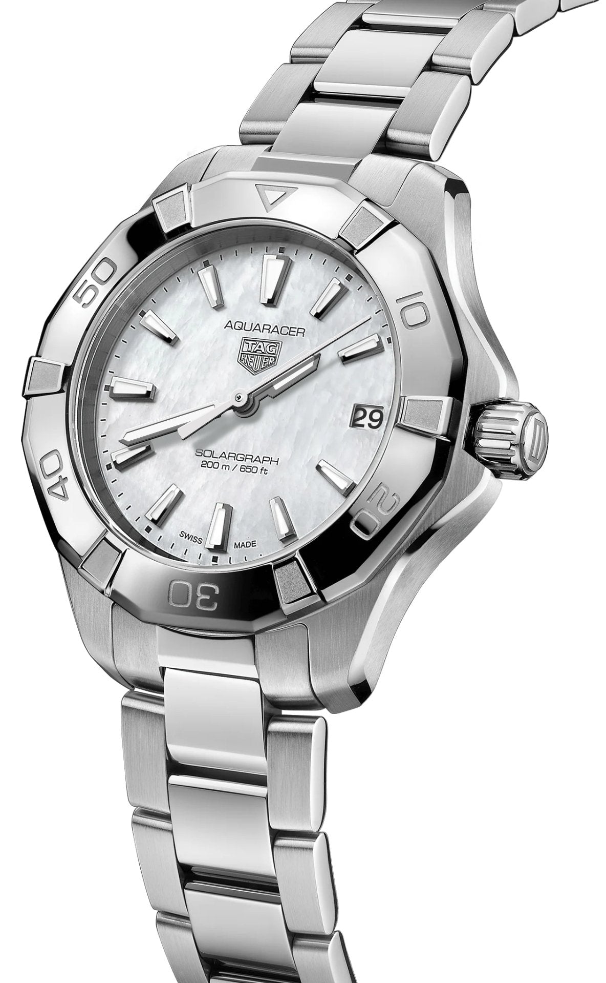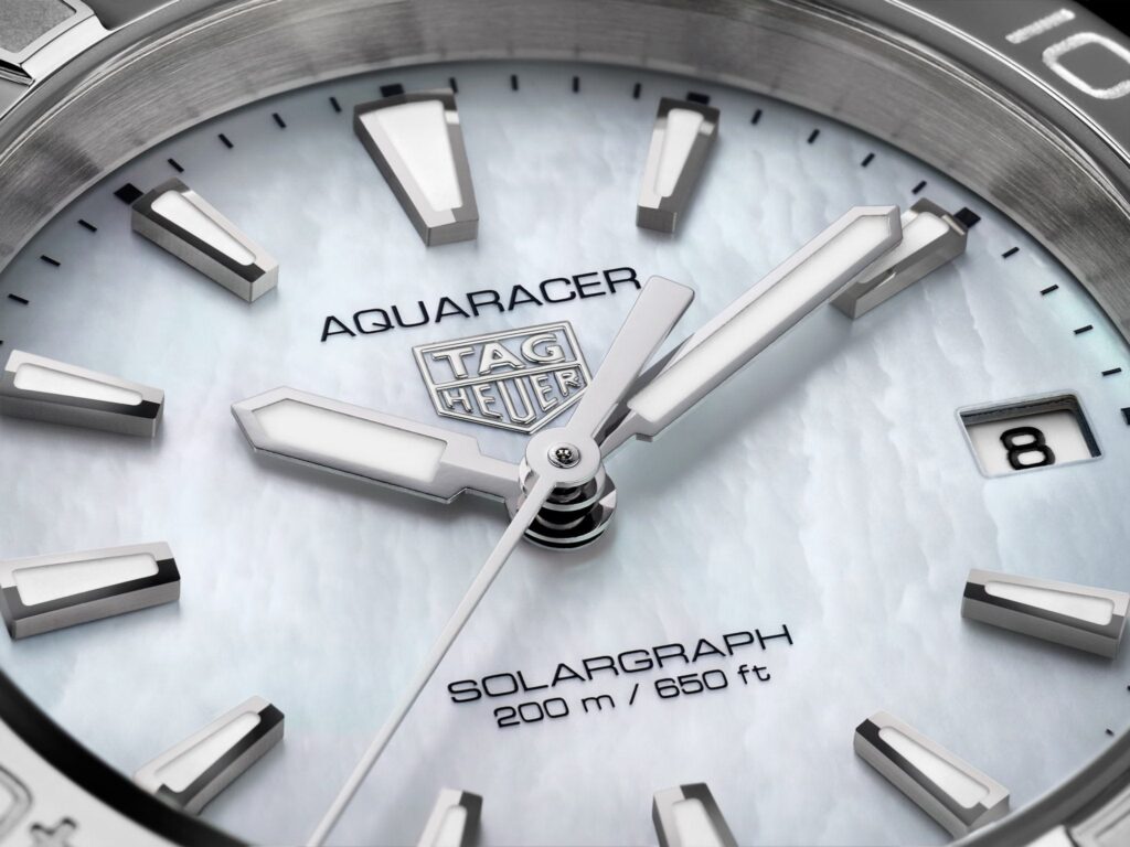 TAG Heuer Aquaracer Professional 200 Solargraph 34 WBP1312.BA0005. Immerse yourself in the celestial allure of the northern lights with this TAG Heuer Aquaracer, equipped with our Solargraph movement. Designed as an elegant yet resilient timepiece for the modern explorer, this sumptuous 34 mm watch is your go-to companion for rugged adventures and urban sophistication.