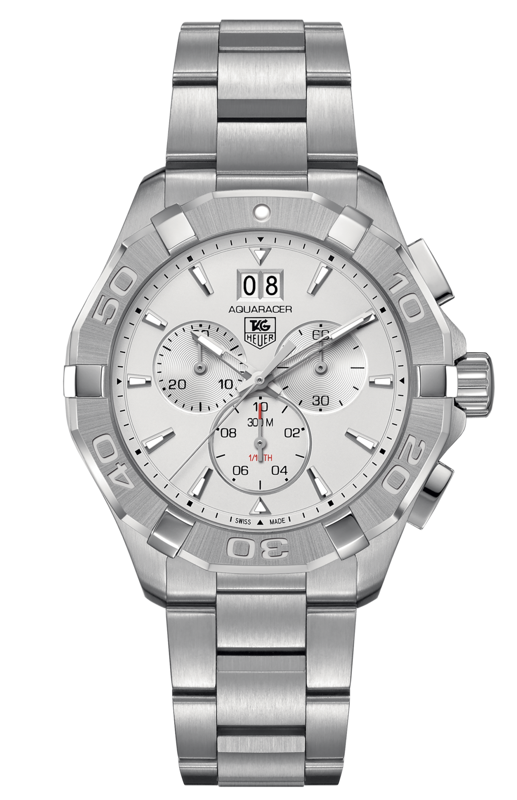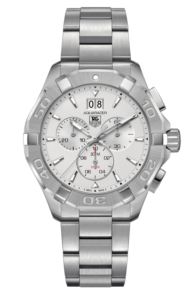 - Silver dial with silver-tone skeleton hands and index hour markers date display at the 12 o’clock position; Chronograph – three sub-dials displaying: 60 second, 30 minute and 1/10th of a second