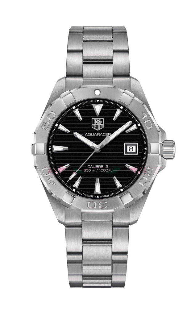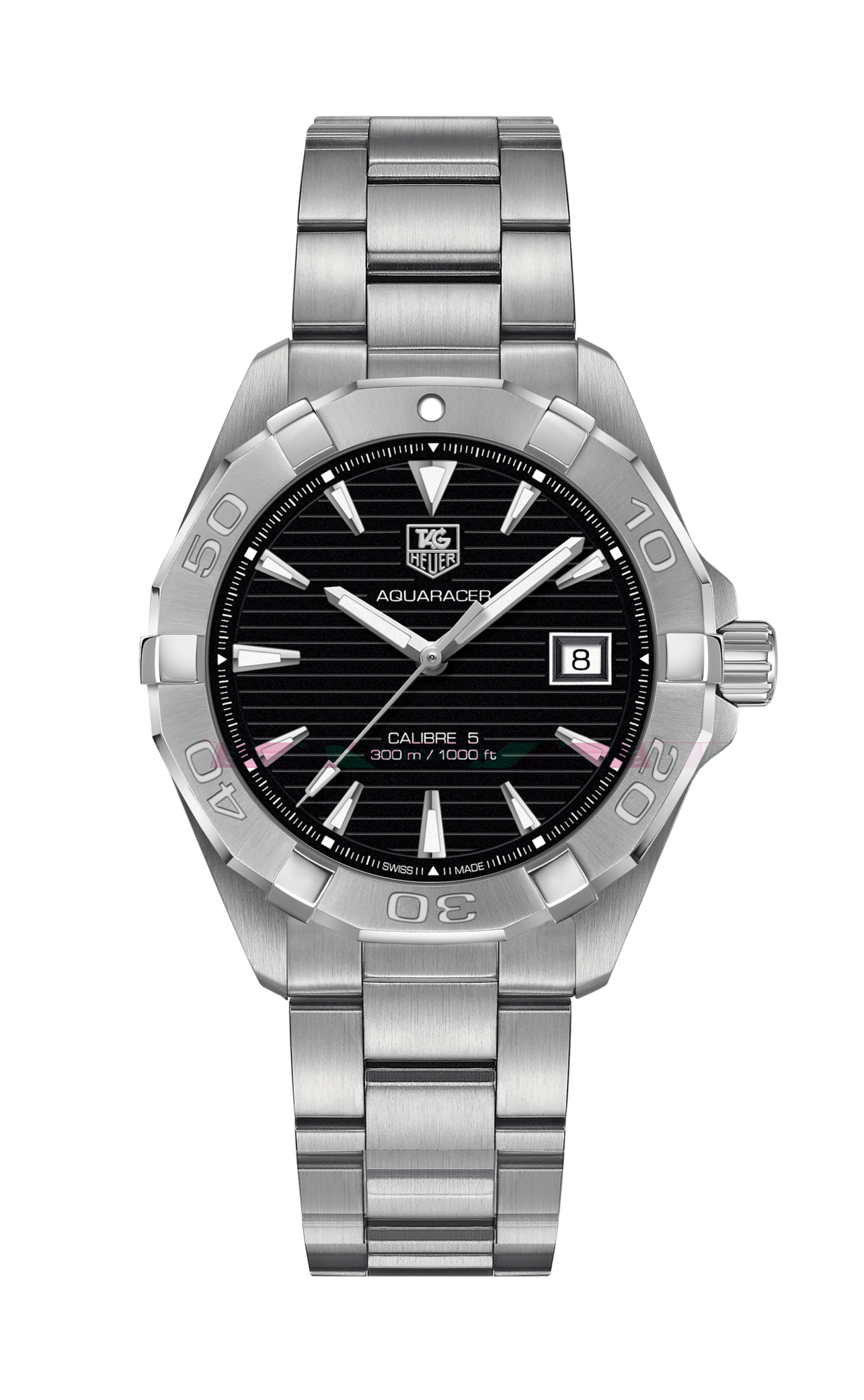 Tag Heuer Aquaracer Calibre 5 automatic Watch with a black dial, set with silver hour makers, with a date display window, set in a brushed stainless steel case and bracelet. With a scratch resistant sapphire crystal glass.