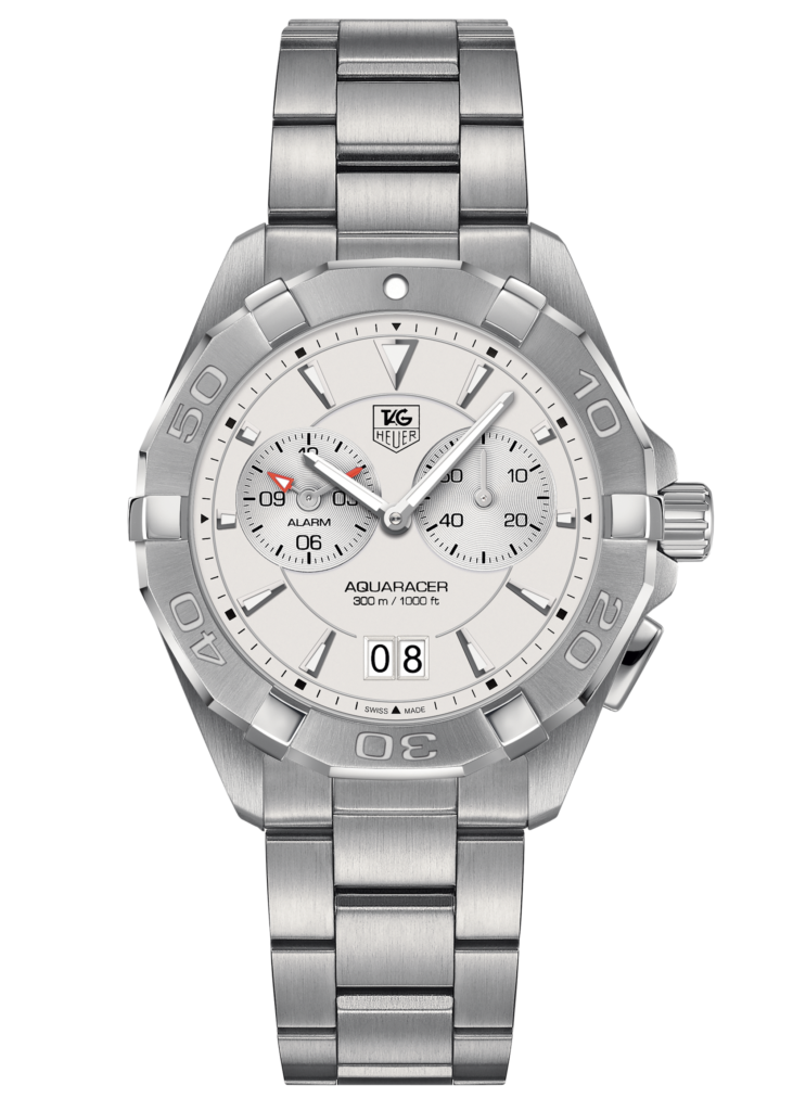 TAG HEUER Aquaracer Gent’s Watch has a Stainless steel case with a stainless steel bracelet. Uni-directional rotating stainless steel bezel. Silver opaline dial with luminous silver-tone hands and index hour markers. Minute markers around the outer rim.