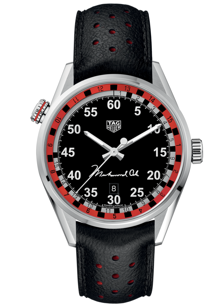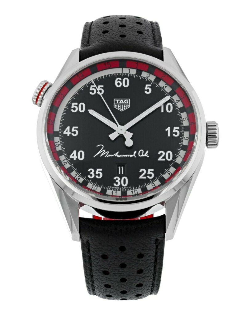 This special edition features an engraving of Muhammad Ali on the case back along with his signature printed on the dial above 6 o’clockPowered by an Tag Heuer Calibre 5 self-winding mechanical movement which contains 26 jewels and has an approximate 38-hour power reserve. Date display is located at the 6 o’clock position. Comes with Tag Heuer box, papers