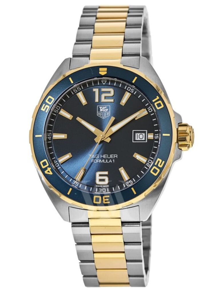 Date display at the 3 o’clock position. Quartz movement. Scratch resistant sapphire crystal. Screw down crown. Solid case back. Round case shape, case size: 41 mm, case thickness: 11 mm. Band width: 20 mm, band length: 8 inches. Deployment clasp. Water resistant at 200 meters / 660 feet. Functions: date, hour, minute, second. Luxury watch style. Watch label: Swiss Made. Item Variations: WAZ1120 BB0879, WAZ1120-BB0879, WAZ1120/BB0879, WAZ1120BB0879. Tag Heuer Formula 1 Navy Blue Dial Two-tone Men’s Watch WAZ1120.BB0879.