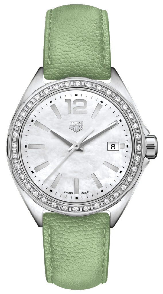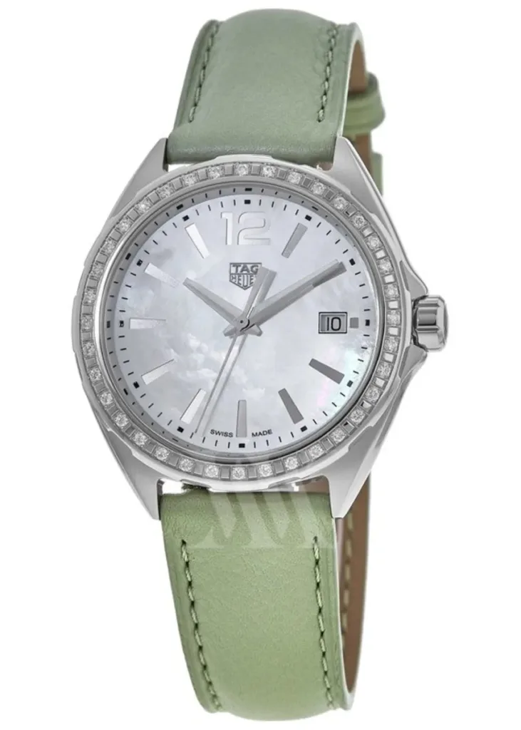 This Tag Heuer Formula 1 watch, designed with a mother of pearl dial and a luxurious green leather strap, is the epitome of elegance and functionality. The quartz movement ensures accurate timekeeping while the diamond accents add a touch of luxury. Perfect for any woman looking for a timeless timepiece.