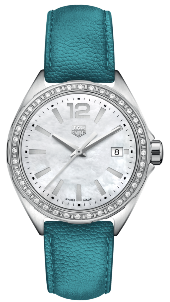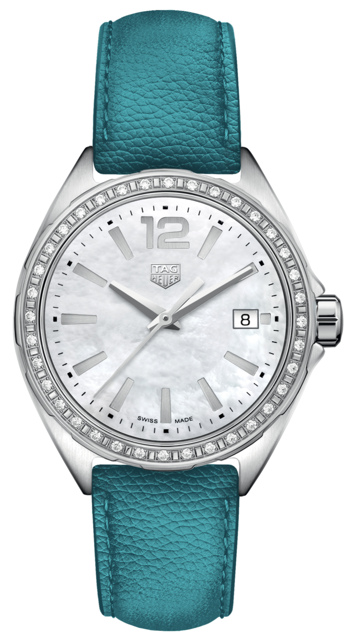 Pull / push crown. Solid case back. Round case shape. Case size: 35 mm. Tang clasp. Water resistant at 100 meters / 330 feet. Functions: date, hour, minute, second. Additional Info: bezel set with 36 diamonds. Formula 1 Series. Dress watch style. Watch label: Swiss Made. Tag Heuer Formula 1 Quartz Ladies Watch WBJ131A.FC8256.