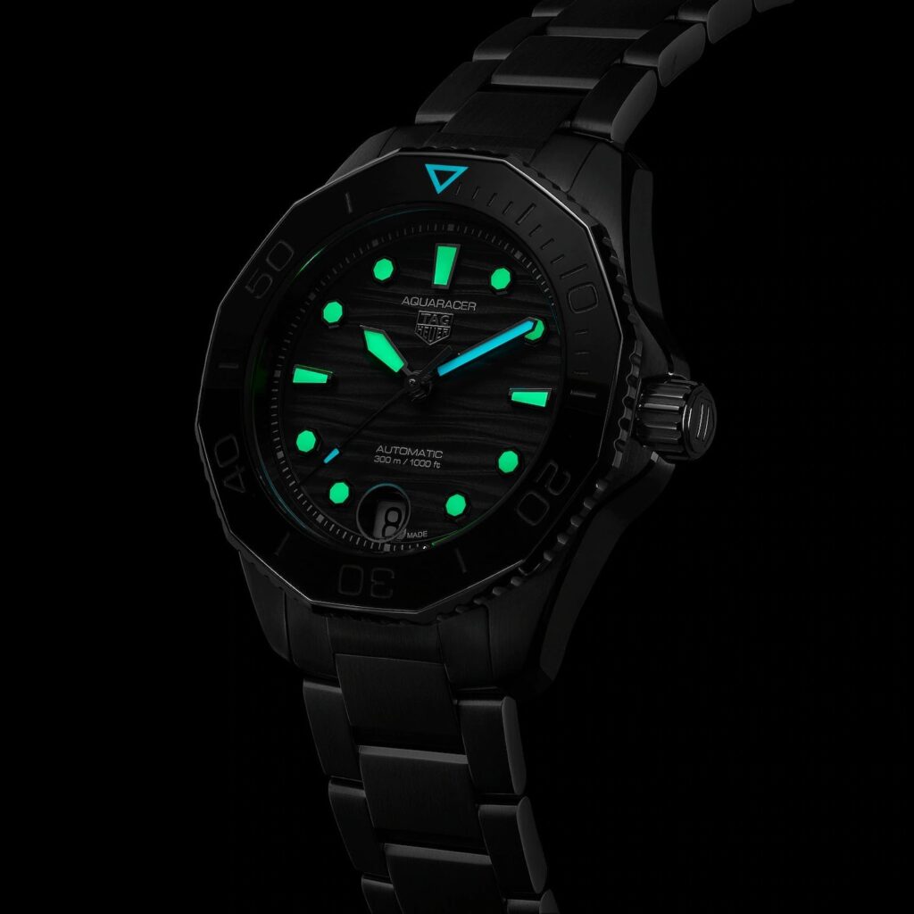 The TAG Heuer Aquaracer WBP231D.BA0626 Ladies’ Diver Watch is an exquisite fusion of elegance, precision, and functionality, designed for adventurous women who appreciate sophisticated craftsmanship. This watch features a striking black dial with a horizontal wave-like texture that adds depth, reminiscent of the ocean’s surface. The luminous hour markers and hands ensure that time is easy to read in any light condition, while the polished markers add a refined touch.