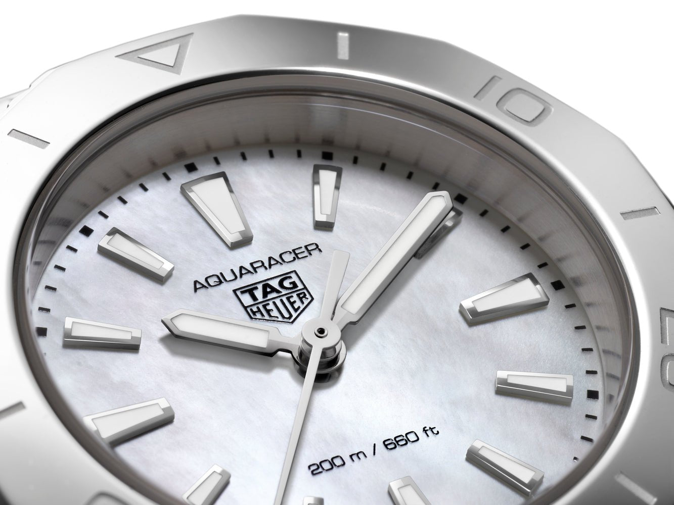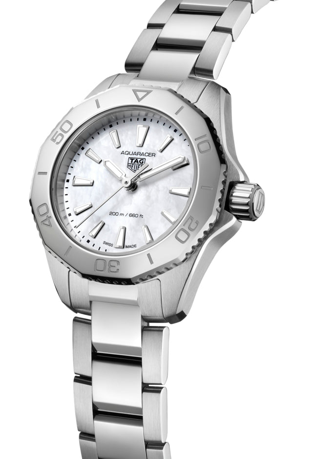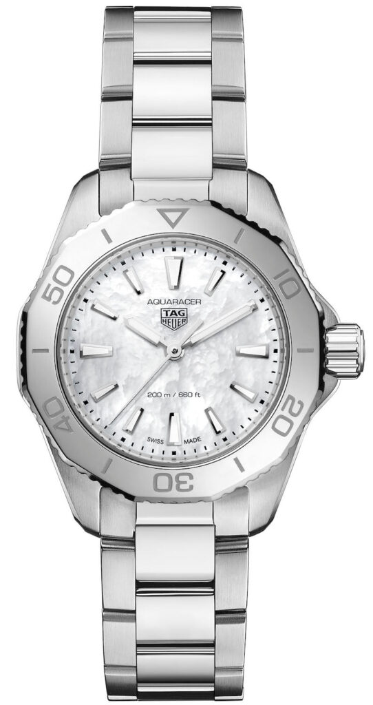 The TAG Heuer Aquaracer WBP1418.BA0622 is an elegant ladies’ watch that exudes sophistication with a sporty edge. Featuring a stunning white mother of pearl dial, polished stainless steel bracelet, and durable sapphire crystal, this timepiece perfectly blends luxury and functionality. The 30mm stainless steel case ensures a comfortable fit, while luminescent markers make it easy to read even in low-light conditions. With water resistance up to 200 meters, the TAG Heuer Aquaracer WBP1418.BA0622 is designed for active lifestyles, making it ideal for both everyday wear and aquatic adventures. Elevate your style with this versatile, Swiss-made watch that symbolizes class and reliability.