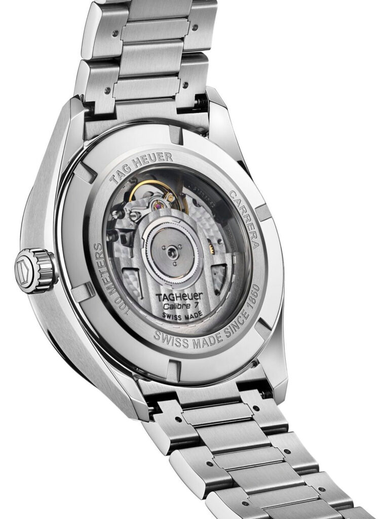 The rest of the TAG Heuer Carrera Calibre 7 Twin Time Automatic Mens watch follows in the footsteps of other modern-day Carrera watches with an elegant stainless steel profile, tapering lugs, a smooth fixed bezel and a water resistant rating of 100 metres. There’s also the re-designed H-shape stainless steel bracelet offering greater comfort and style. Housed within the 41mm stainless steel case is the Calibre 7 automatic winding movement which not only powers the GMT hand but hours, minutes, seconds and date complication and an impressive 50 hour power reserve. You can admire the movement through the exhibition case back alongside it’s rose gold coloured oscillating rotor.