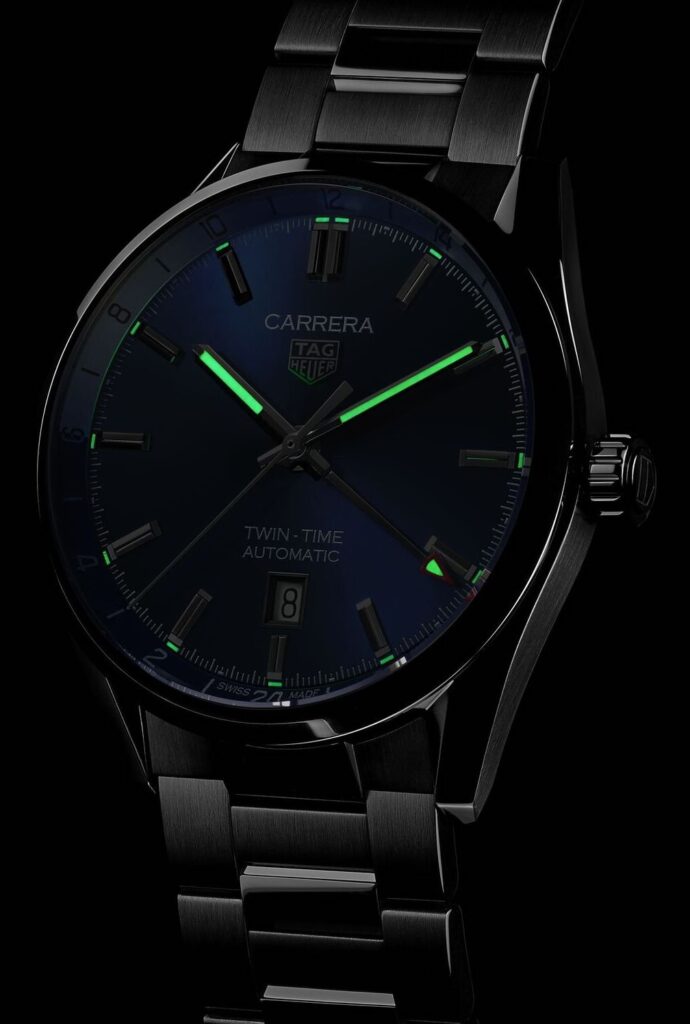 The leading model in the Swiss watch manufacturer’s Carrera Three Hands collection, the TAG Heuer Carrera Calibre 7 Twin Time watch is the perfect wrist companion for any traveller with a two-time zone display at the centre of its handsome blue sunray brushed dial. The GMT hand stands out instantly for its bold red arrow-shaped tip which extends out to the discreet outer flange decorated with a 24 hour scale. The flange can also be used as a day and night indicator with one half finished in silver for daytime and the latter in blue for night. The dial of the TAG Heuer Carrera Twin Time watch also boasts rhodium plated hands and indexes coated in glow in the dark Superluminova.