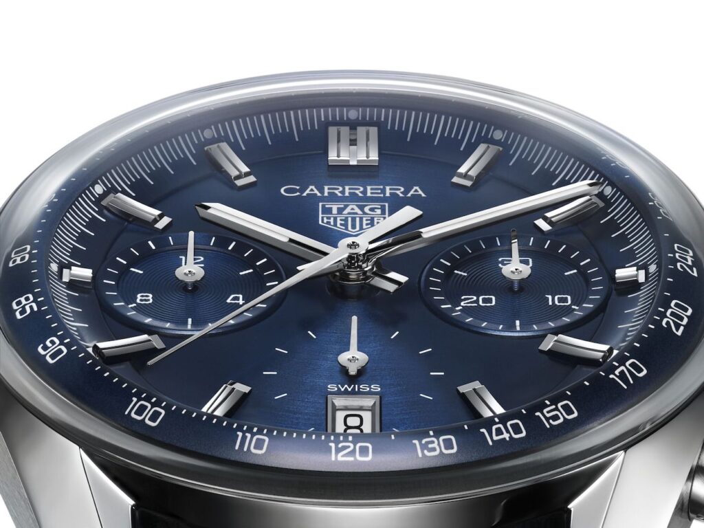 - Deep blue chronograph dial with subscales at 3, 6 and 9 o’clock