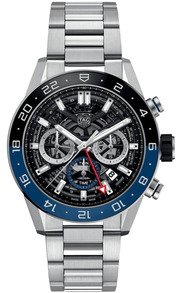 This TAG Heuer Carrera watch exposes its own engine, the Calibre Heuer 02 self-winding movement, through the dial where you can see the highly intricate mechanism consisting of 168 components and 33 jewels. The calibre also equips the timepiece with hour, minutes and central chronograph seconds, a bold red GMT hand, date function at 4 o clock, 12 hour chronograph counter at 9 o clock, 30 minute counter at 3 o clock and seconds counter at 6 o clock. Housing the impressive movement is a 45mm stainless steel case equipped with a ceramic fixed bezel, sapphire crystal glass, an exhibition case back and a sophisticated stainless steel bracelet. As well as boasting an exposed skeletonised dial, this TAG Carrera Calibre Heuer 02 GMT watch comes fitted with rhodium plated luminescent indexes and striking red and blue accents to complete the motor racing inspired aesthetic.