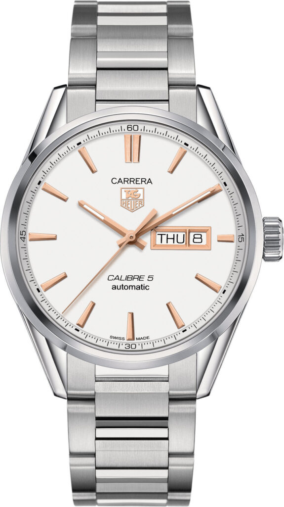 Renowned for their highly accurate and powerful movements, TAG Heuer have equipped this TAG Heuer Carrera watch with one of their famous Swiss made self-winding calibres. The Calibre 5 automatic movement brings to life the hour, minute and seconds function and a day date window at 3 o clock on a mesmerising white concentric pattered dial with rose gold plated hands coated in Superluminova and rose gold plated indexes. Housing the dial is sapphire crystal glass known for its scratch resistance and crisp legibility alongside a 41mm stainless steel case and exhibition case back. For one final touch of sophistication, this TAG Heuer Carrera watch for men is fitted with a classic stainless steel bracelet and folding style buckle.