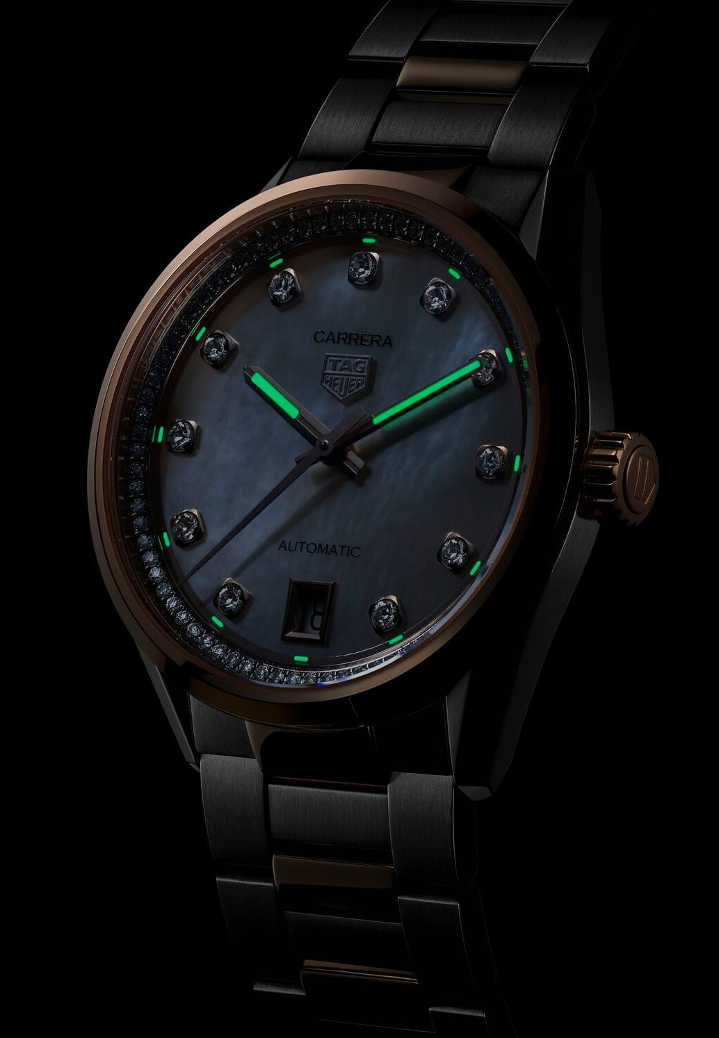 - Mother of pearl dial with diamond dot indexes