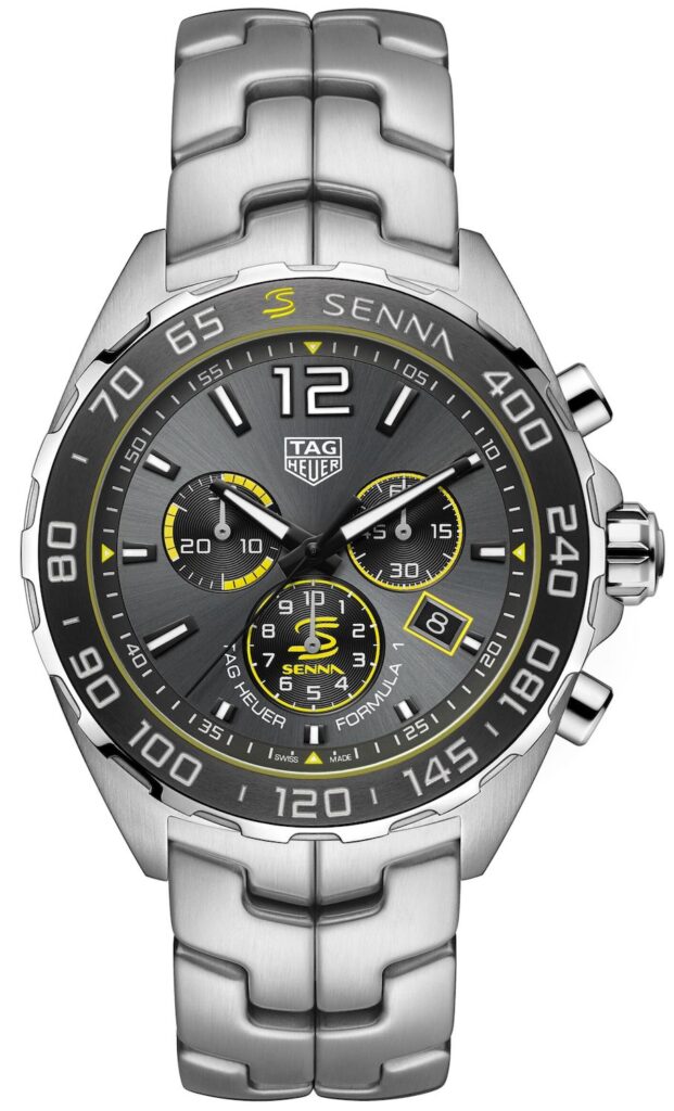 With a sleek 43mm stainless steel body and ceramic fixed bezel, this TAG Heuer Formula 1 watch provides an elegant aesthetic just like that of the race car driver that inspired it. The striking anthracite grey sunray dial is beautifully detailed with Superluminova coated hour and minute hands, three black and yellow subsidiary counters and a date window at 4 o’ clock. Each of these handy functions are powered by a Swiss quartz movement which is kept hidden behind a circular screw-in case back decorated with a special Senna engraving inspired by the Formula 1 race track. To complete the look of this TAG Heuer Formula 1 Ayrton Senna watch, a stylish fine-brushed bracelet is added alongside a folding clasp fitted with a special extension especially designed to fit over a racing suit.