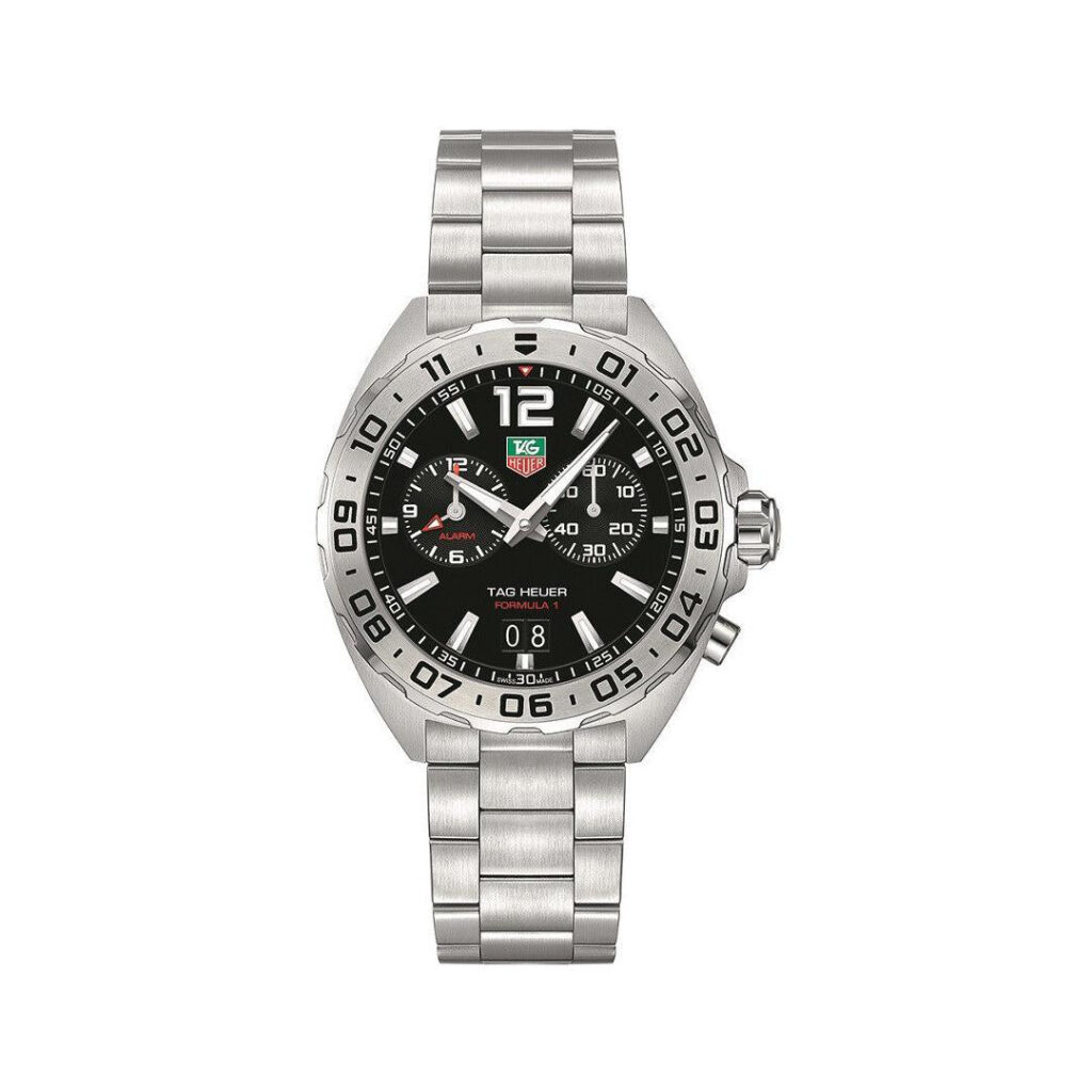 This stunning TAG Heuer Formula 1 watch for men houses one of the brand’s famous quartz movements, considered one of the most reliable and accurate calibres in Switzerland promising an almost perfect precision with a variation of only a few seconds per month. The movement is kept hidden within the fine brushed and polished 41mm stainless steel case and closed case back which is beautifully decorated with a special Formula 1 engraving. Fitted to the case is a sporty unidirectional turning bezel with 60 minute scale, screw down crown and special anti-reflective sapphire crystal glass renowned for its scratch resistance and legibility. The dial of this TAG Heuer Formula 1 Quartz watch is striking thanks to its smooth black finish, sleek steel hands and rhodium plated indexes coated in glow in the dark Superluminova. To complete the look of this men’s TAG watch, a sophisticated stainless steel bracelet is added alongside a classic folding buckle.