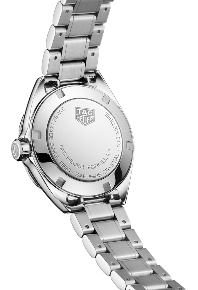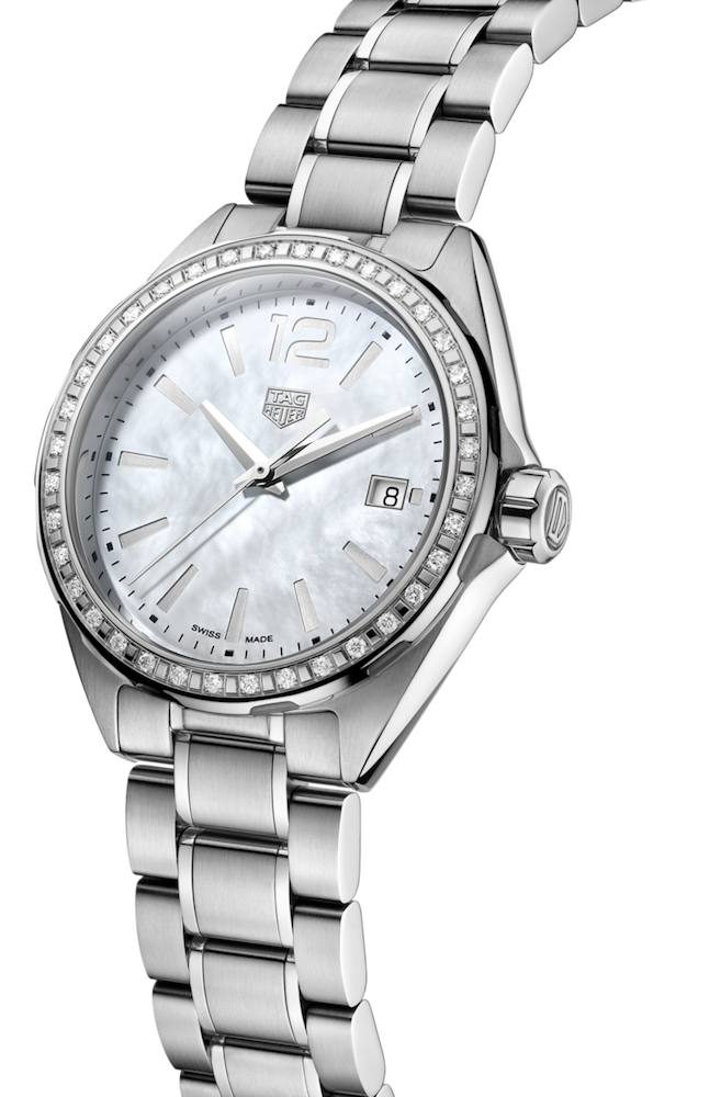 Instantly recognisable, the mesmerising white mother of pearl dial of this TAG Heuer Formula 1 Ladies watch is decorated with the brand’s famous logo at 12 o clock, rhodium plated indexes and sleek steel hands. The neatly sized 32mm diamond decorated stainless steel case is water resistant to 100 metres and moulds elegantly to the wrist thanks to the sleek lugs and sophisticated stainless steel bracelet. Hidden within is a Swiss made quartz movement which equips the timepiece with hour, minute and seconds function, a handy date window at 3 o clock and a special End-Of-Life battery indicator feature. This TAG Heuer Formula 1 watch for women is another fine example of the brand’s ability to embody glamour and functionality and design a timepiece especially for ladies always on the move.