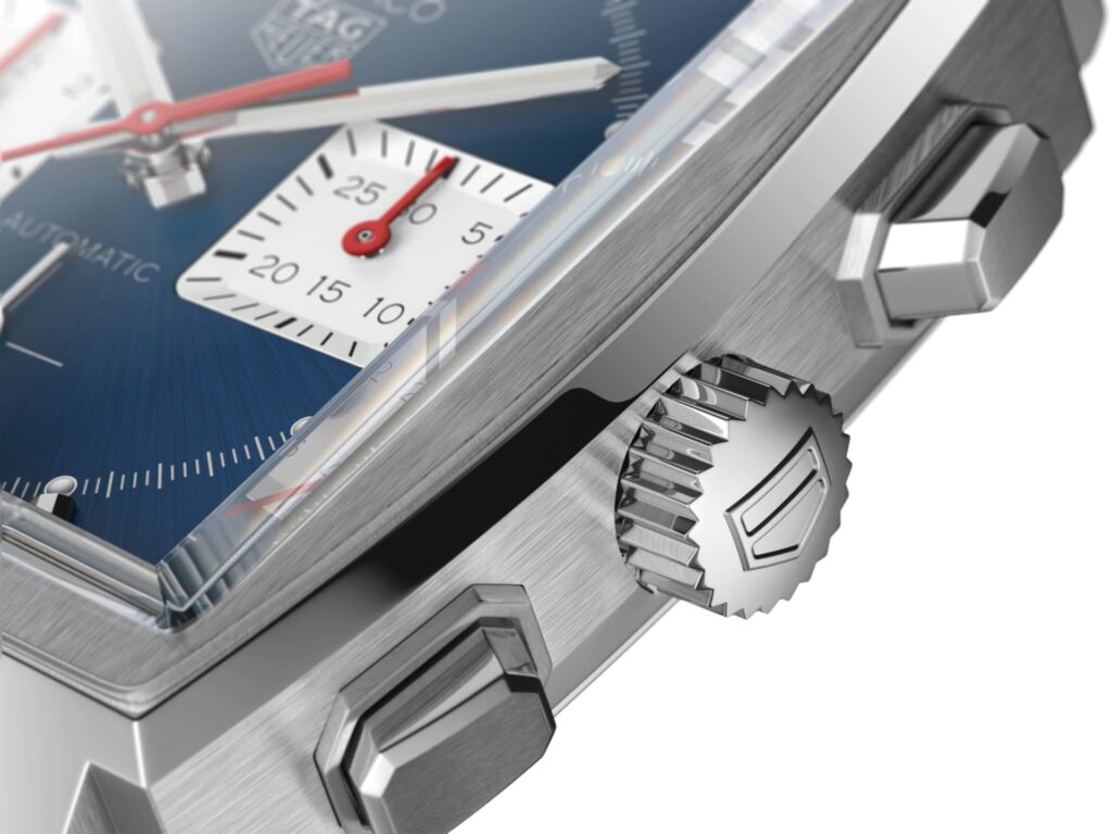 The Heuer 02 movement, which provides an 80 hour power reserve, puts its performance and decoration on show behind a sapphire exhibition caseback. The engine propels a set of Super LumiNova hands and a red coated central chronograph hand around the signature Monaco blue dial. This display is also equipped with sub counters filled with silver, offering 30 minute and 12 hour functions. The small counter at 6 o’clock displays continuous seconds and, as with all elements on the dial, is protected underneath a strong lens crafted from sapphire crystal glass. The watch also features a large date display at 6 o’clock.